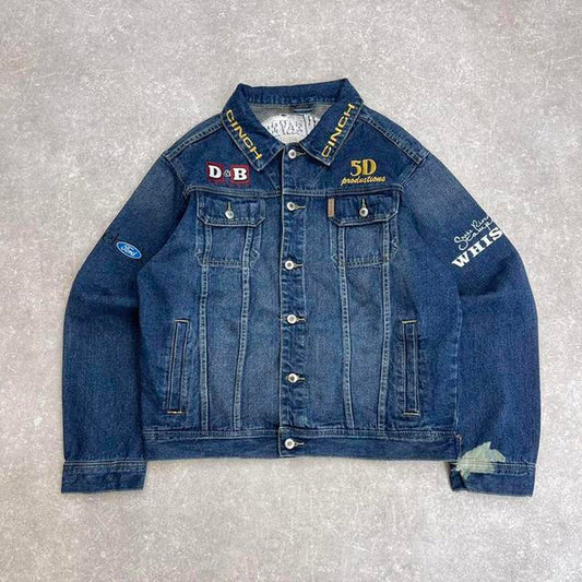 Embroidered denim trucker jacket M black boxy embroidered denim jacket