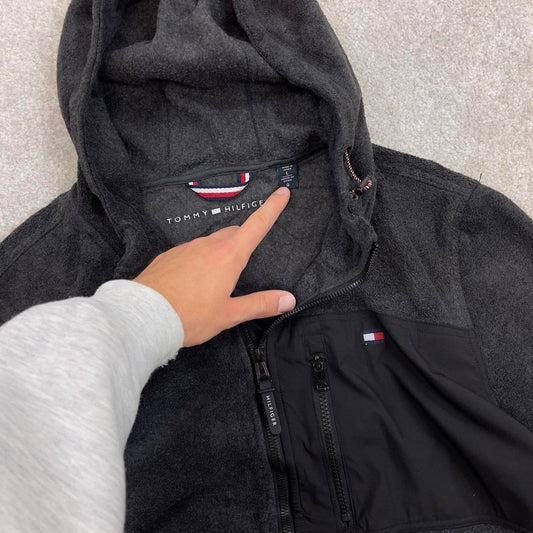Grey Tommy Hilfiger technical fleece jacket Large y2k style hooded full zip embroidered logo hoodie