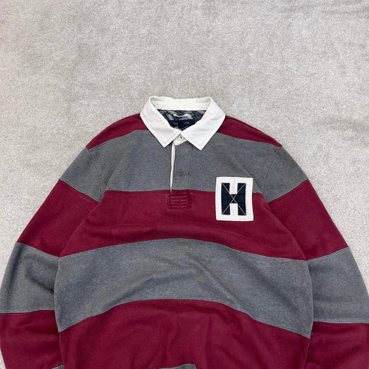 Burgundy grey Tommy Hilfiger vintage style rugby shirt Medium classic striped long sleeve polo loose