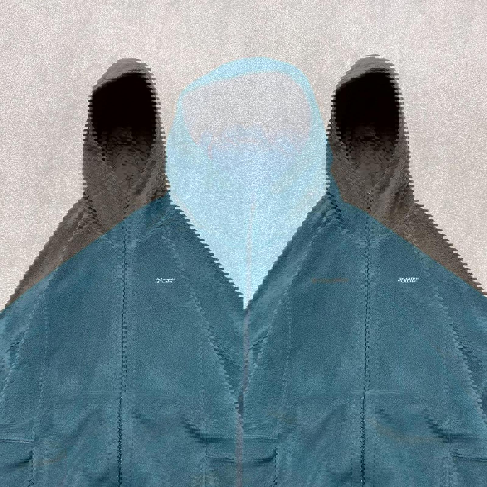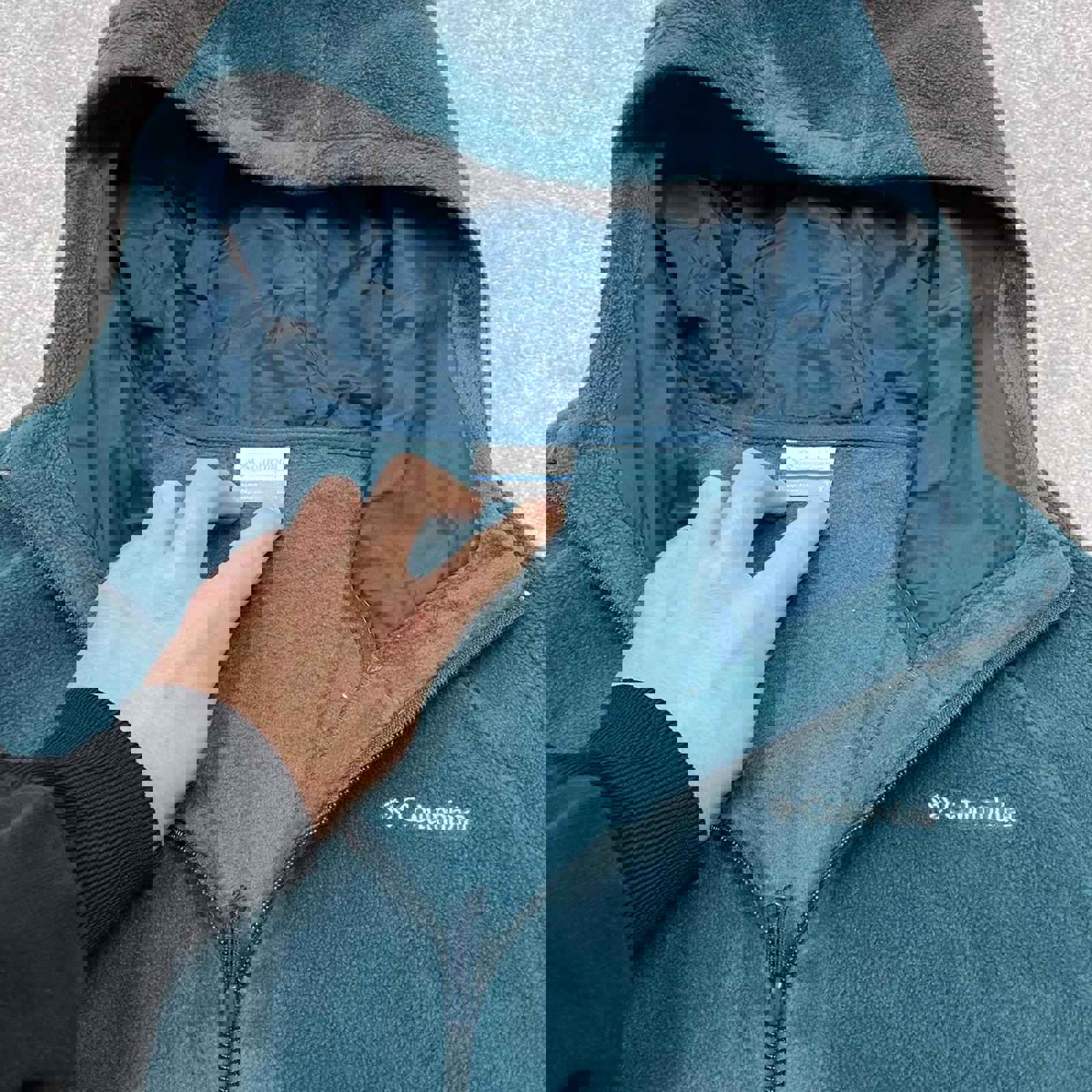 Teal Columbia Sportswear tech fleece with embroidered logo, hood and zip pockets