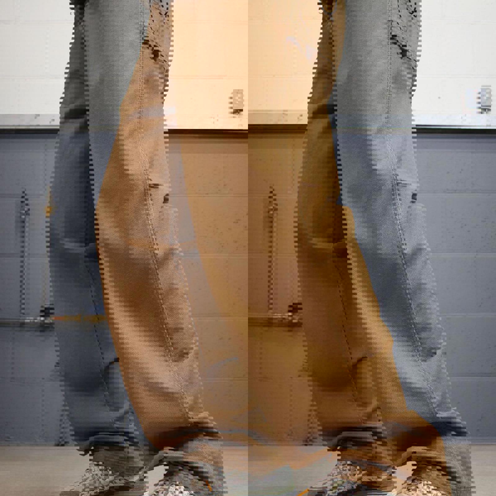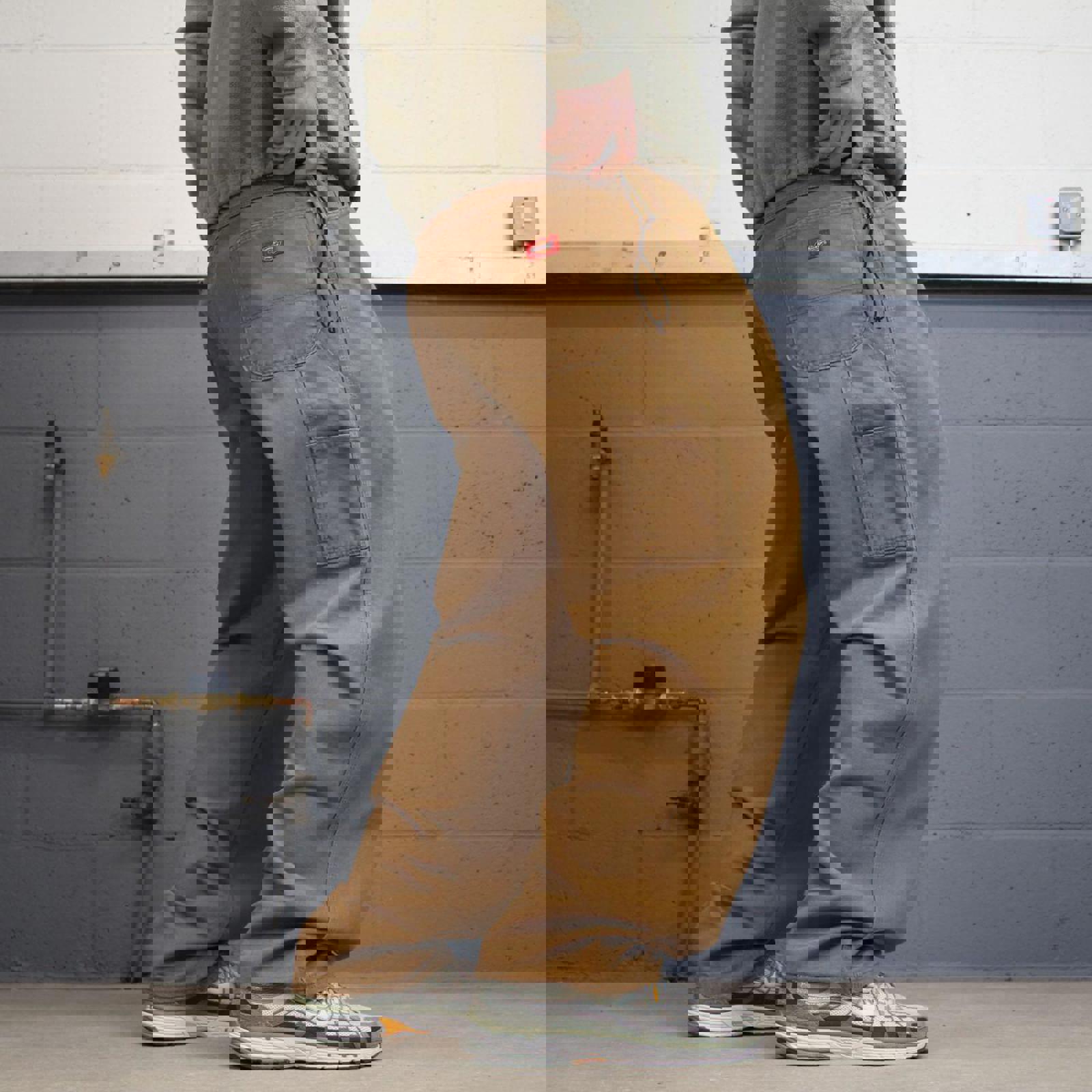 Tan loose Dickies cargo skater jeans with patch logo, hammer loop and utility pockets
