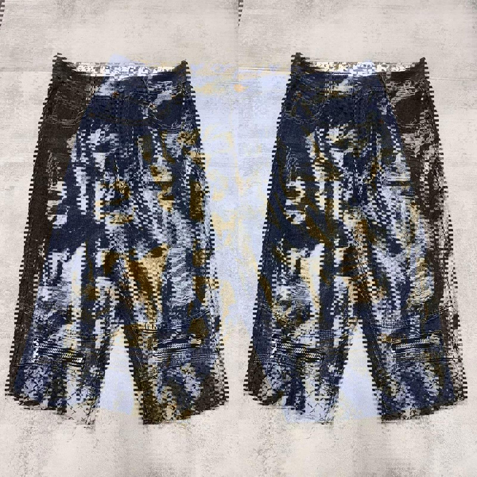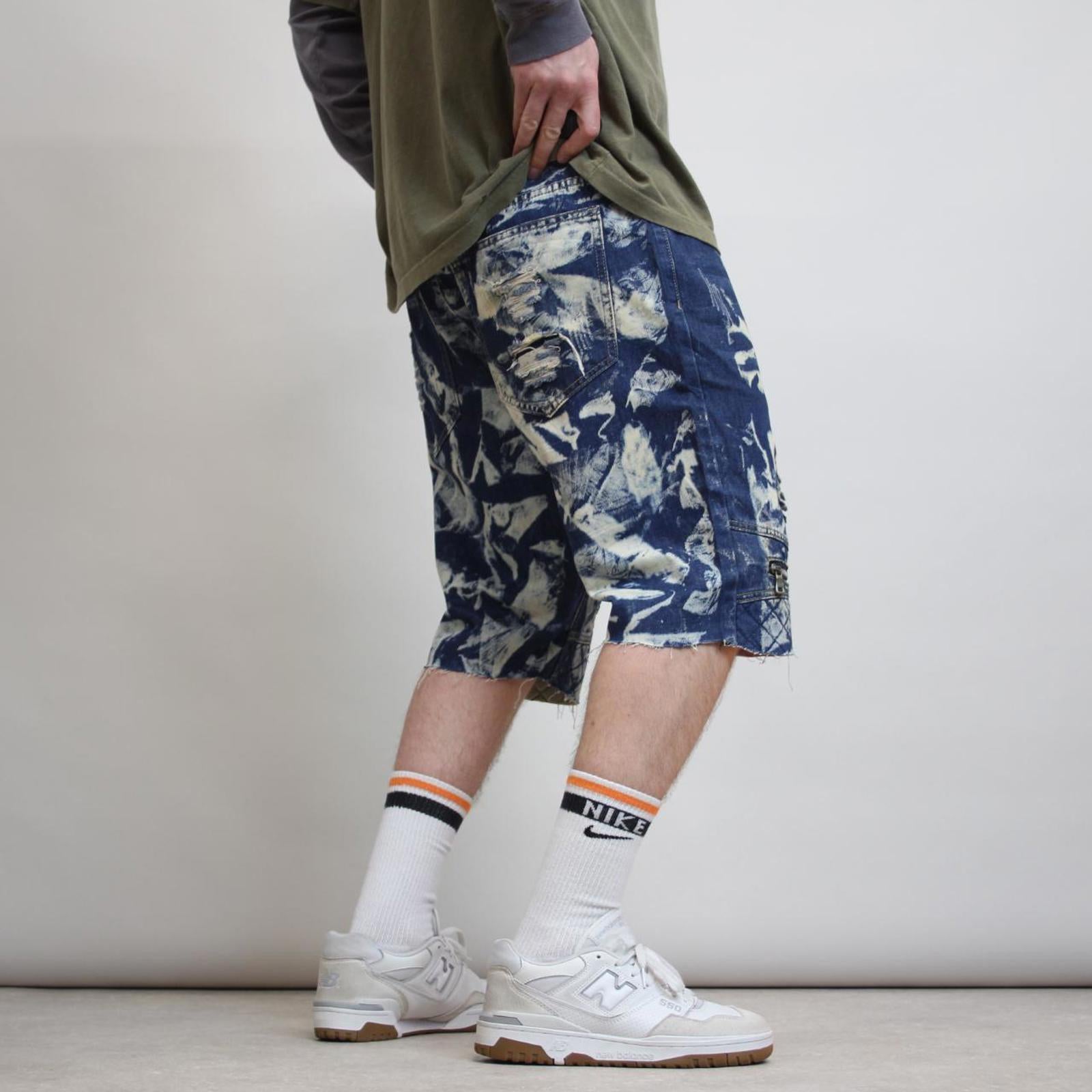 Denim skate shorts Just no logo hip hop jean shorts with distressed design SKU 6-3003 RR Measurements Waist: 38” Inseam: 12.5” Top to bottom: 23” Leg opening width: 10” Tag size: 38 Model: 6ft W36 Condition Good condition with a couple of light marks Cut ends of legs #skater #baggy #grunge #Y2K #preppy