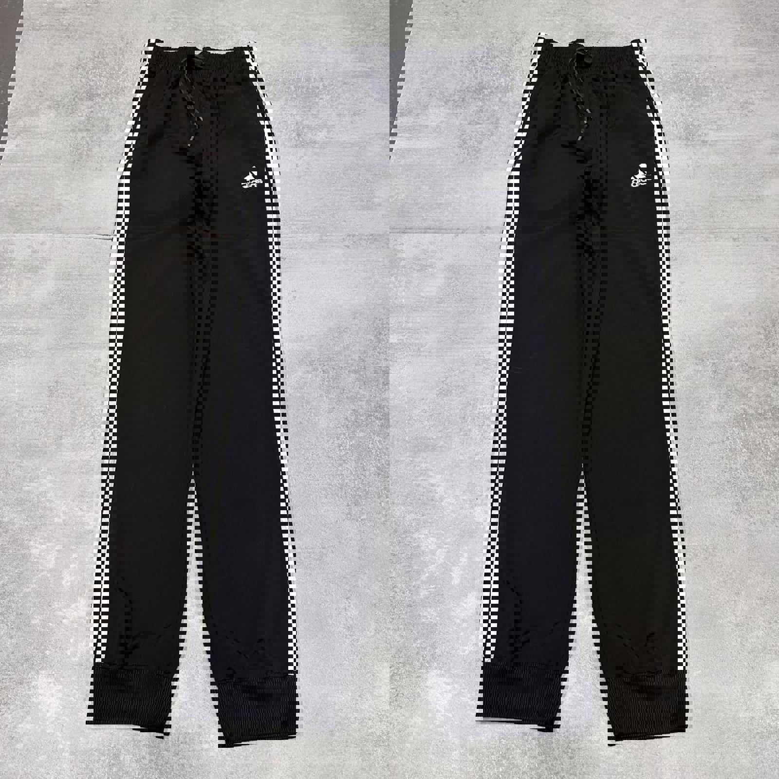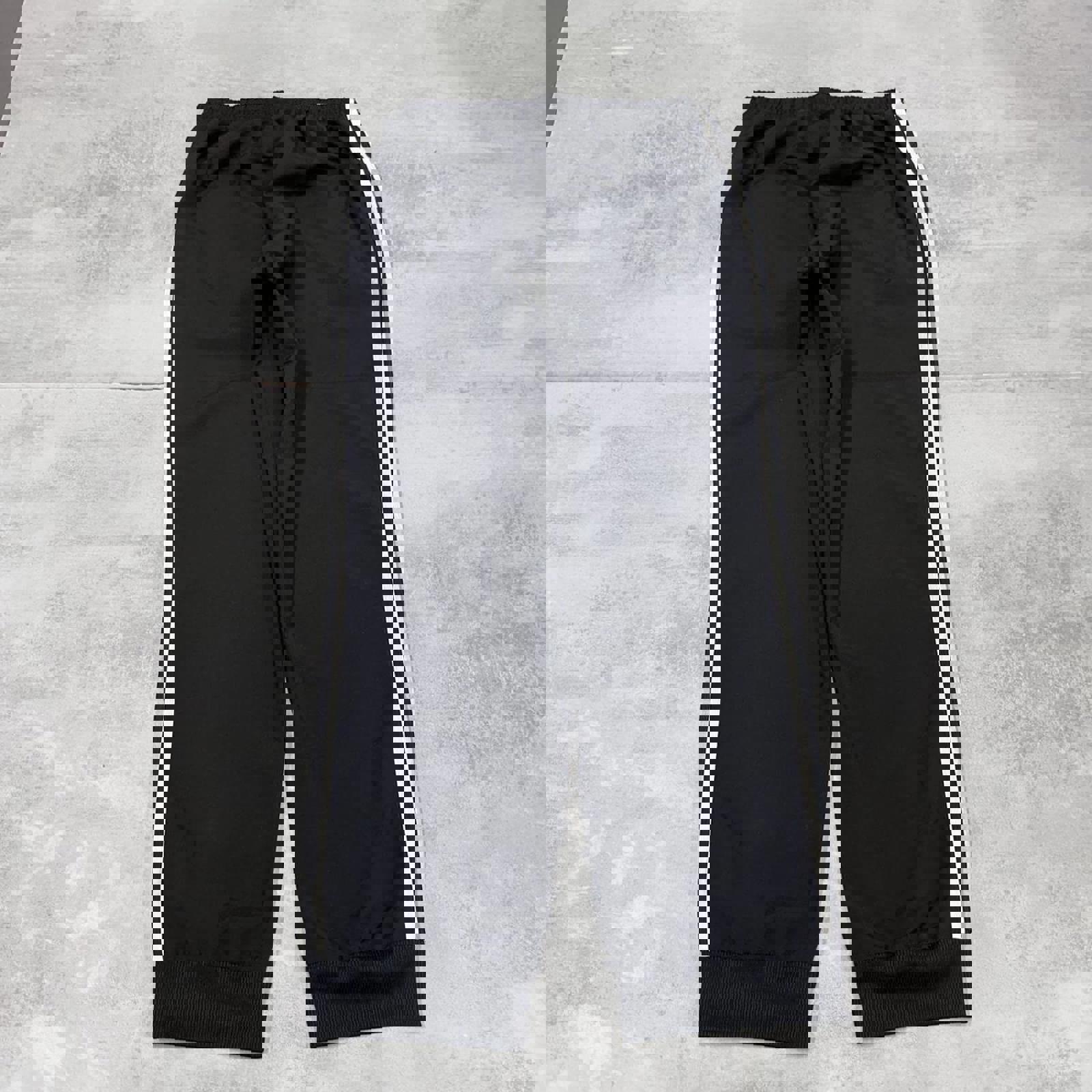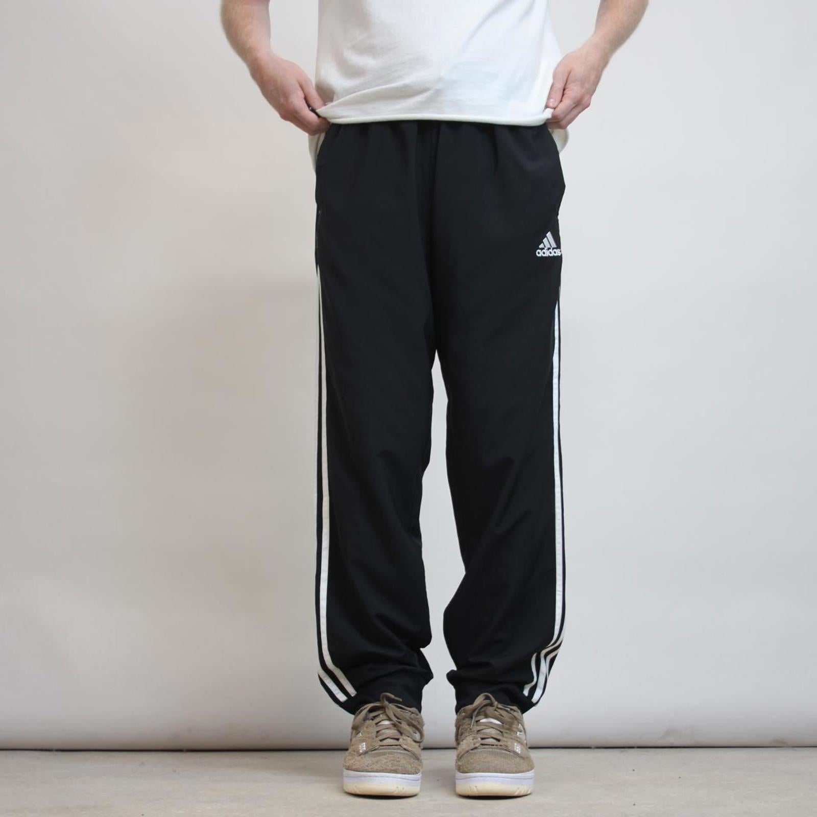 Black Adidas track pants with side stripes, pockets and embroidered logo