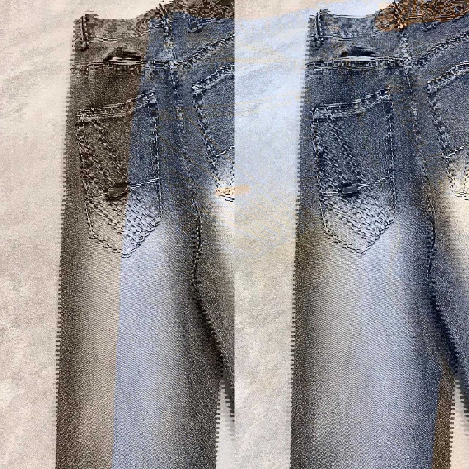 Faded blue Akademiks jeans with waist patch and rear pocket designs