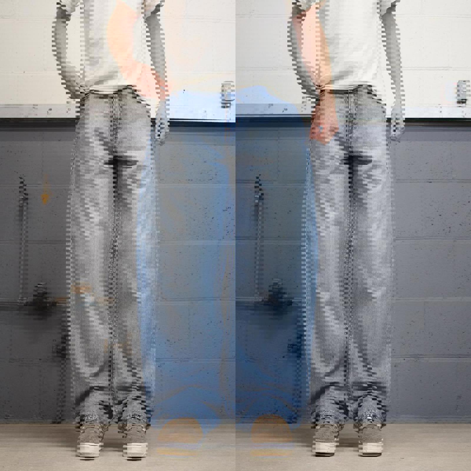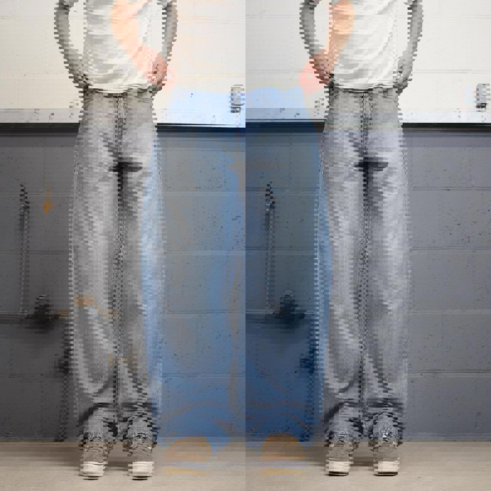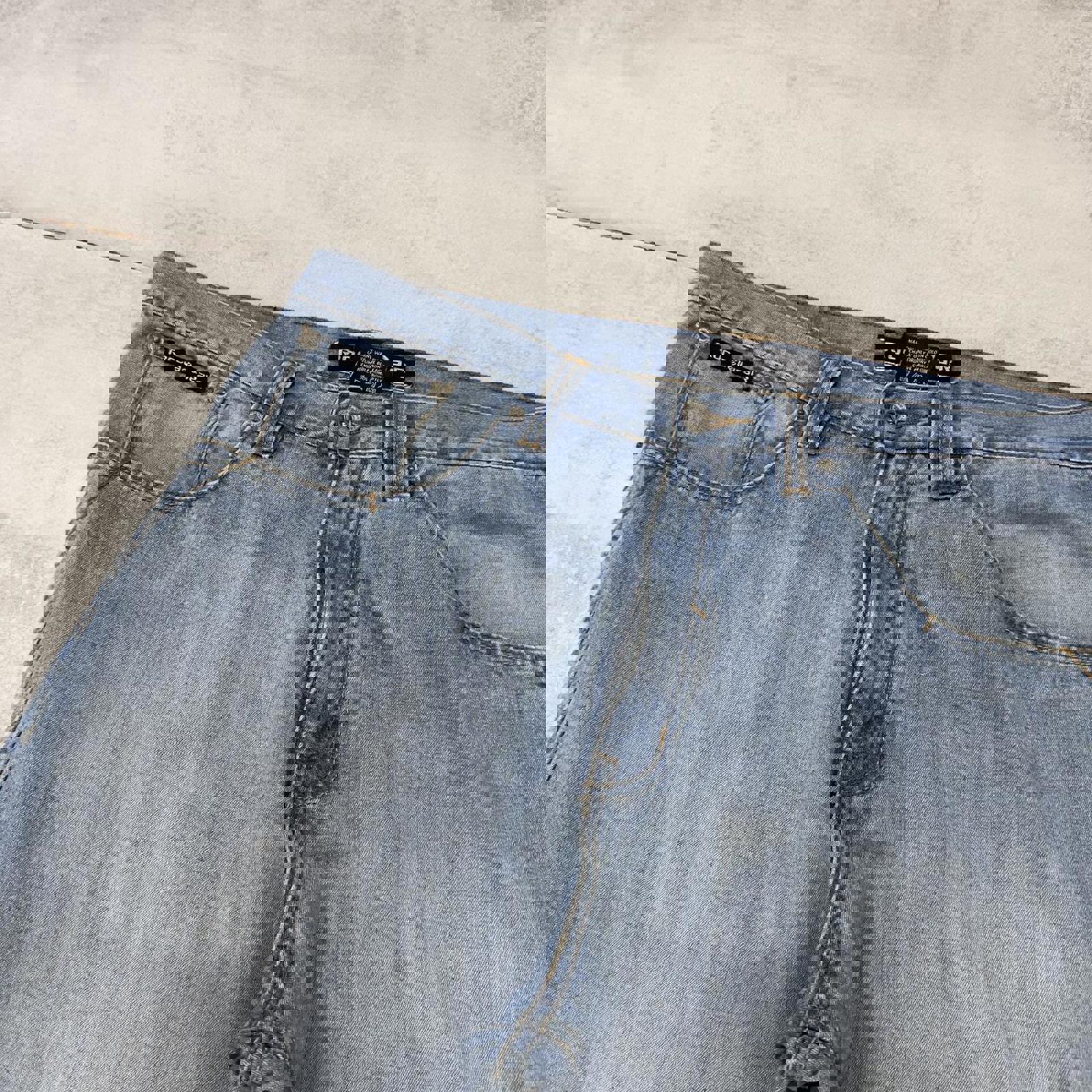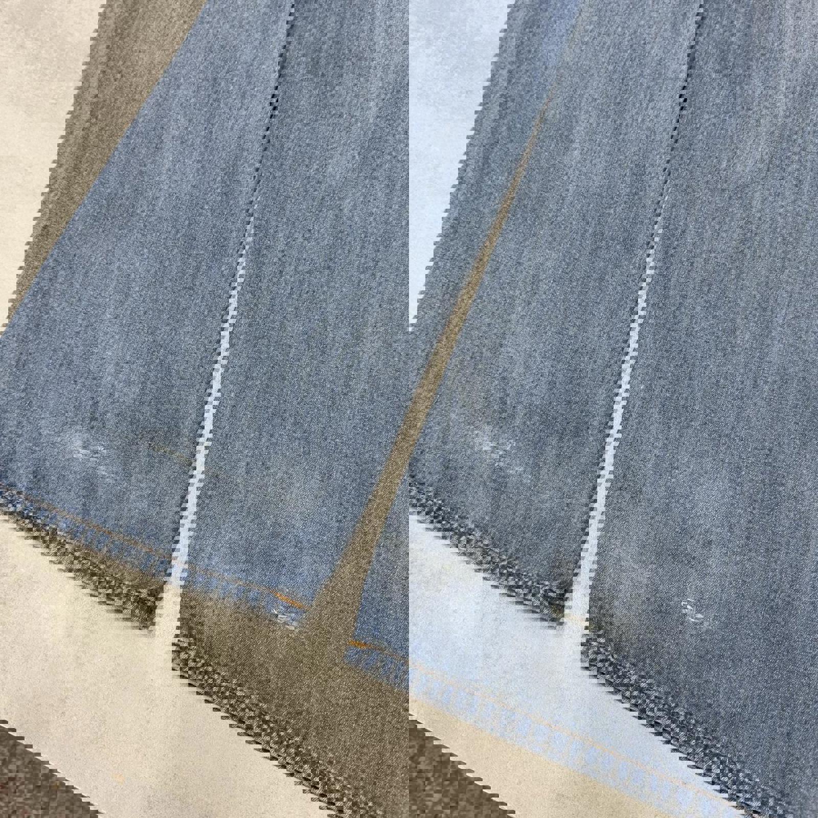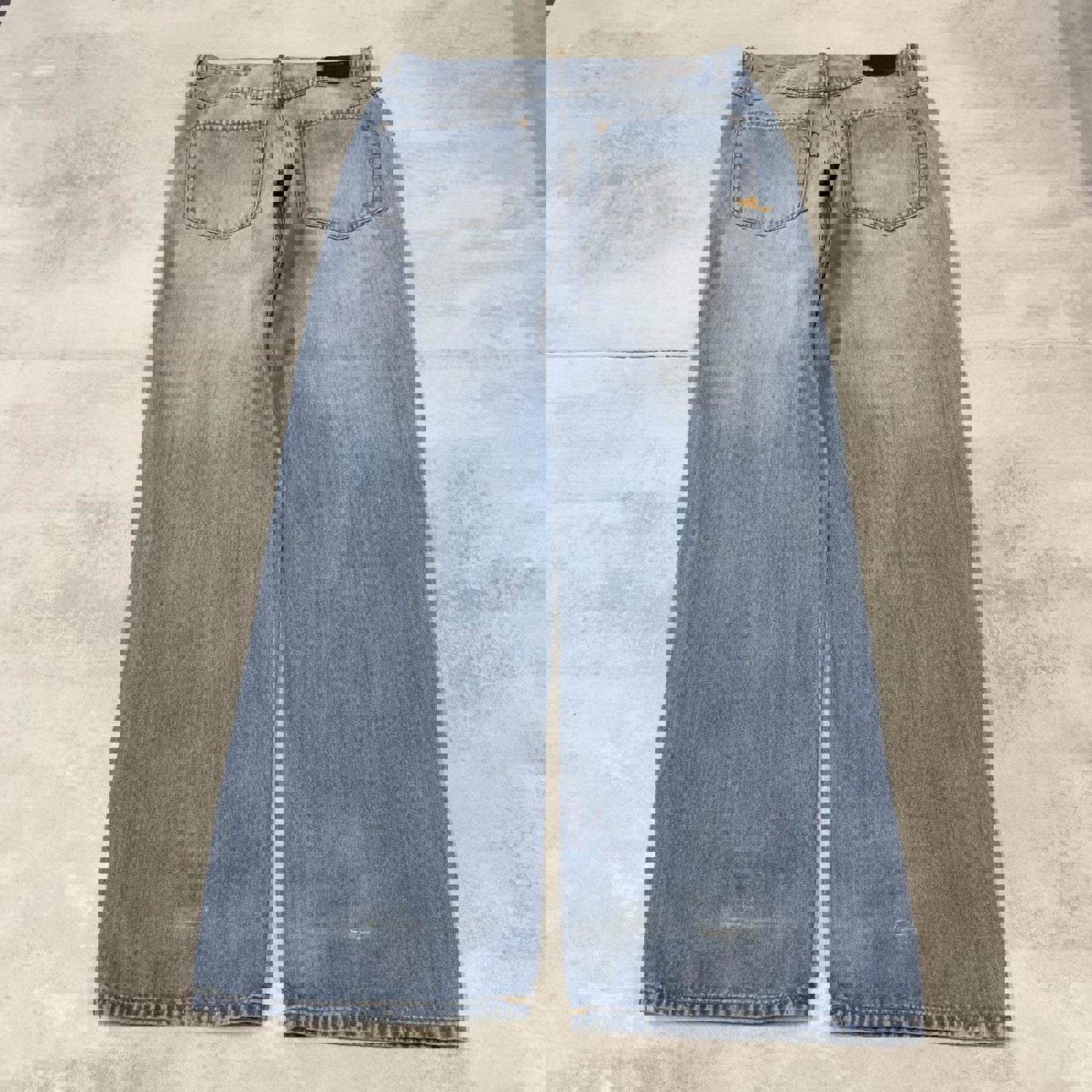 Good condition with denim fading, a couple of marks and light wear. Couple of loose threads on corner of back right pocket seam. small rip and faded marks at end of right leg.