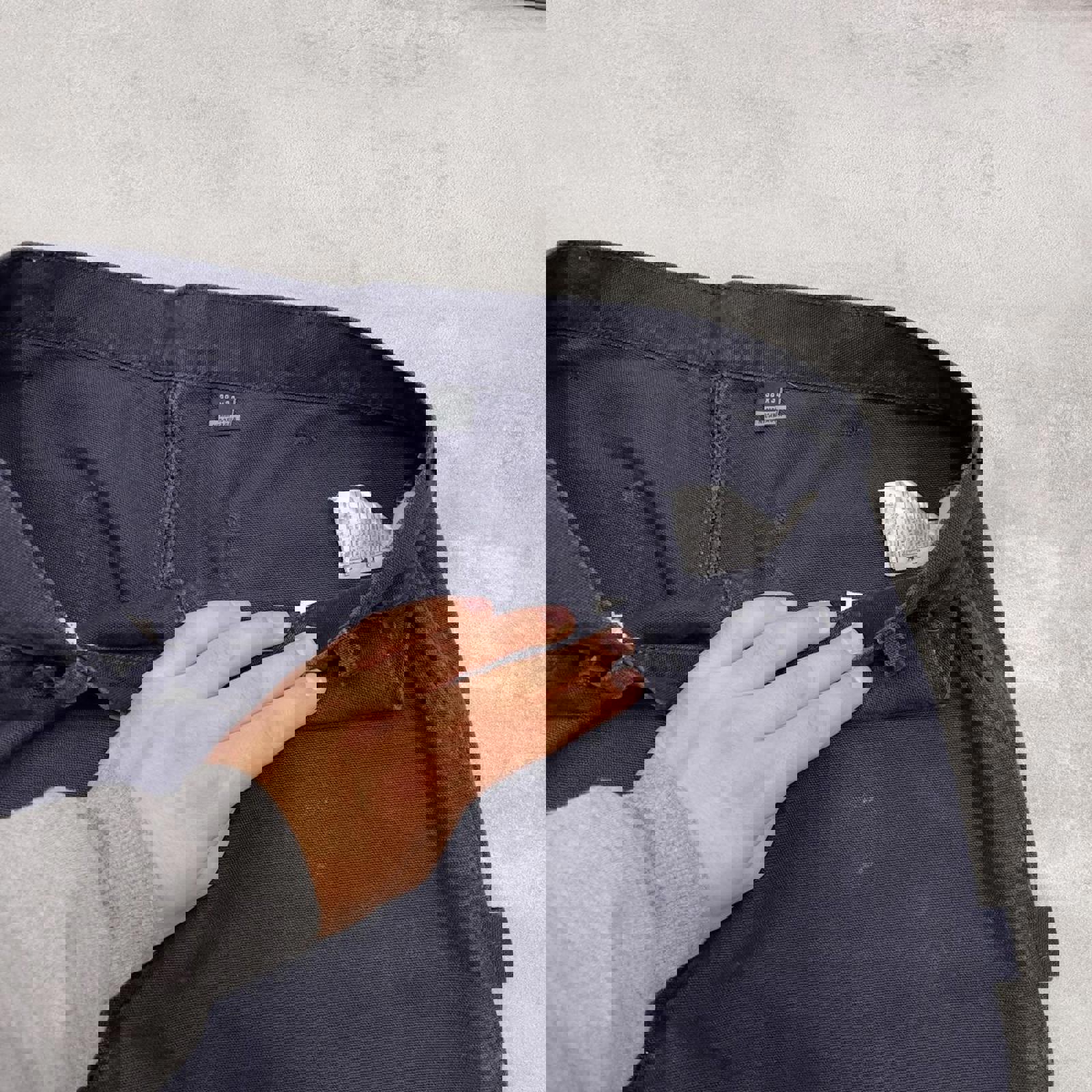 Navy Carhartt cargos with patch logo, hammer loop and carpenter pockets
