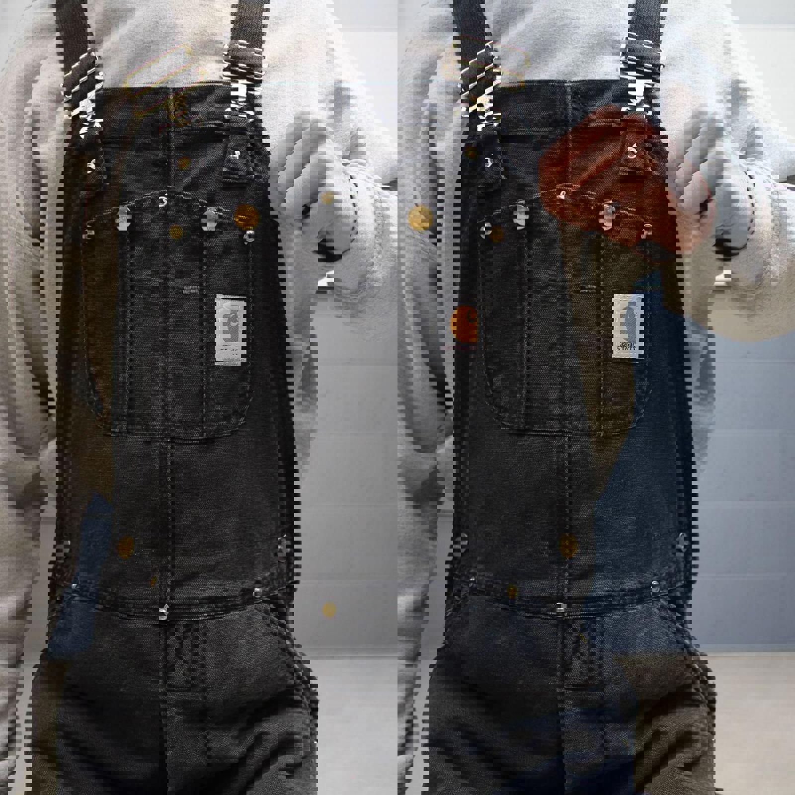 Black quilt lined Carhartt dungarees with patch logo and adjustable straps, perfect festival or skate wear