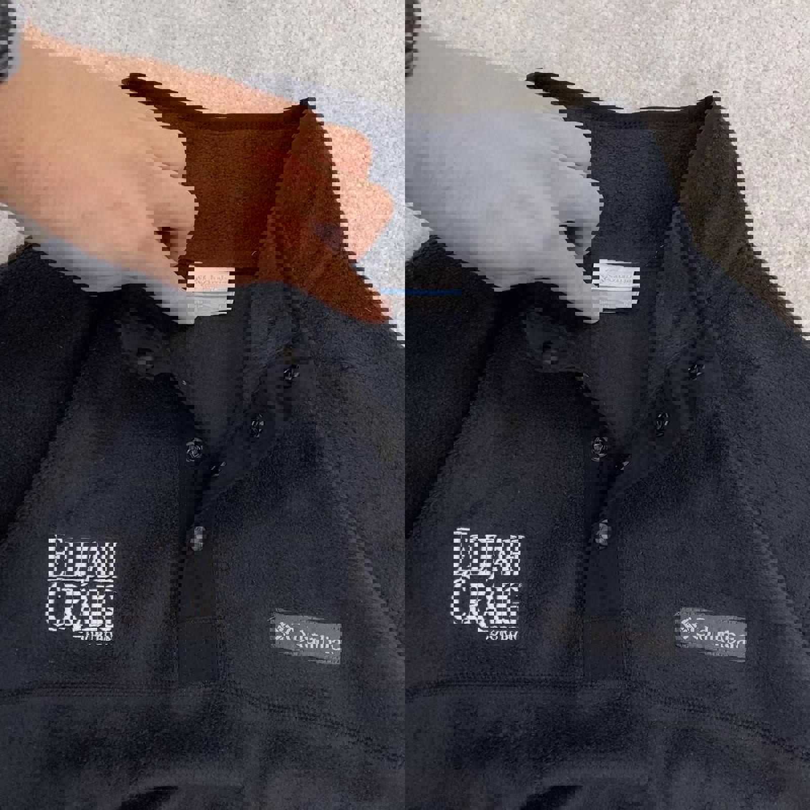 Black Columbia Sportswear technical fleece with patch logo and snap poppers