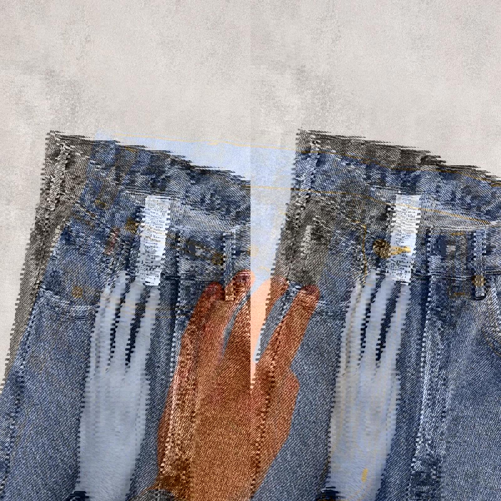 blue denim, double knee, loose fit, cargo style, faded wash, workwear, patch logo, vintage-inspired, thick fabric, relaxed silhouette