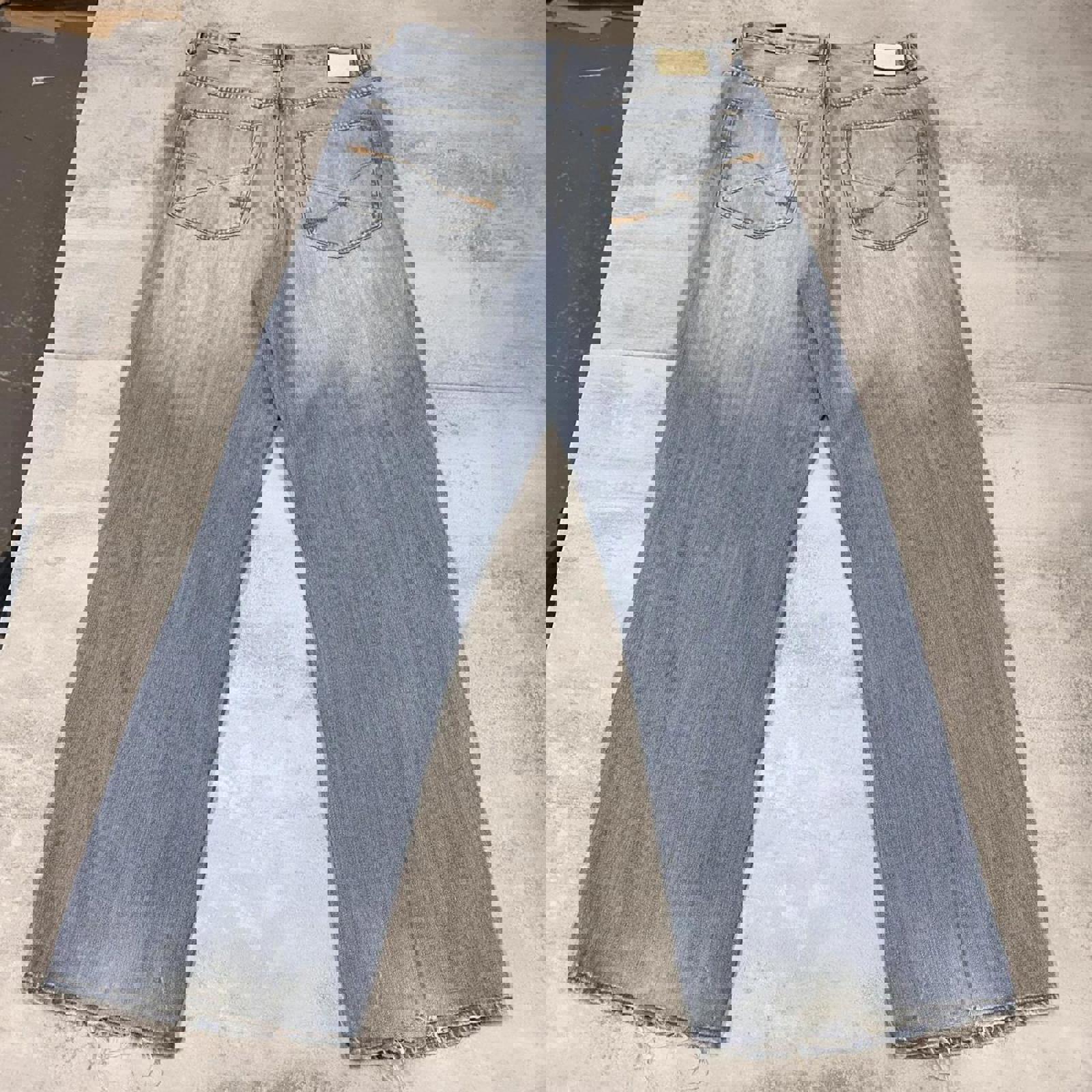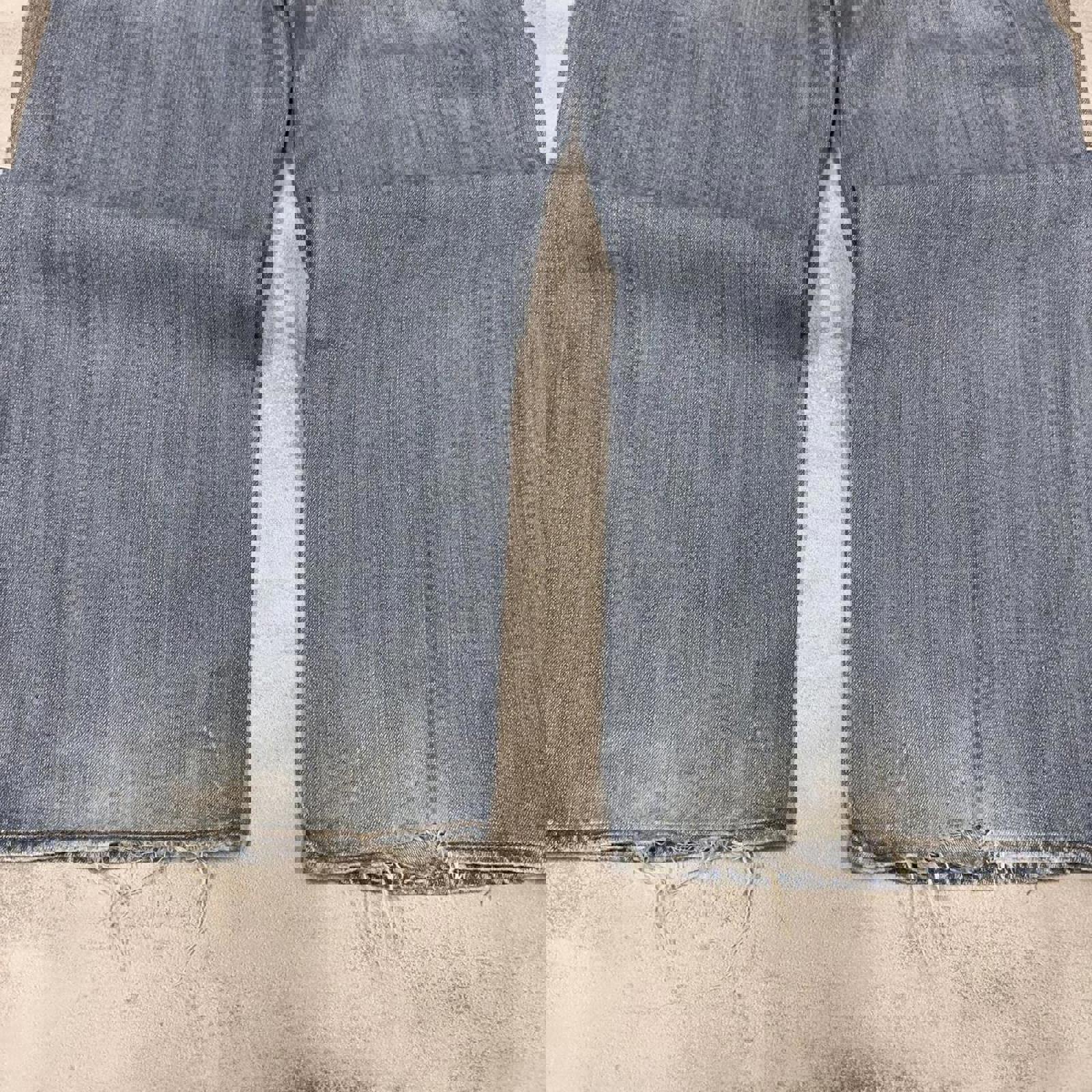 Good overall condition with slight denim fading and a few light marks. Distressing, tear and faded discolouring at ends of legs.