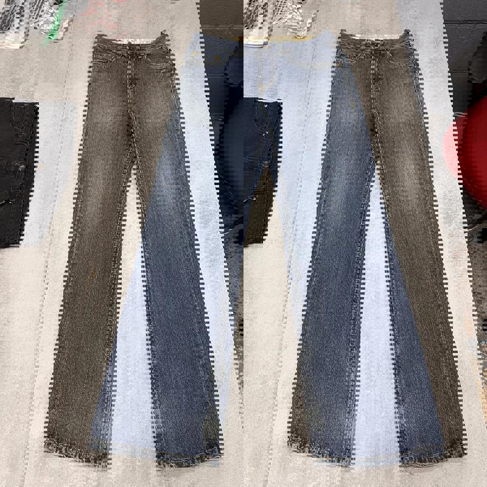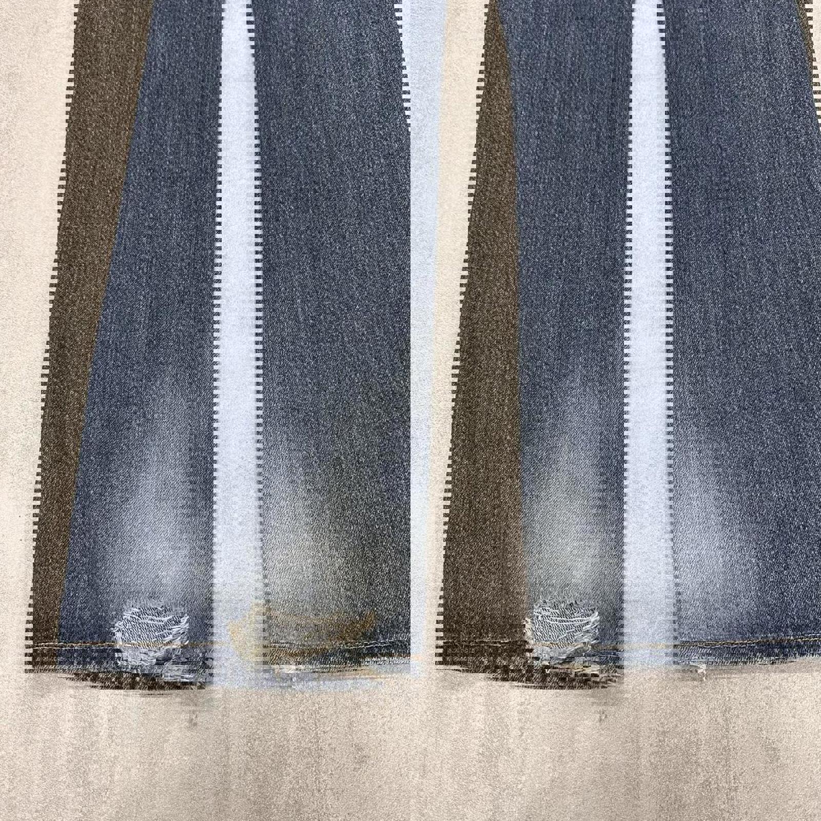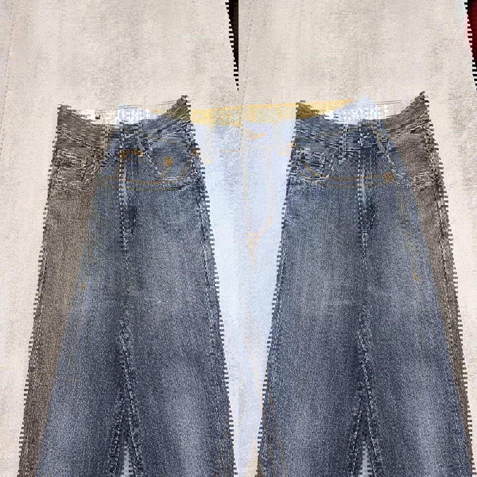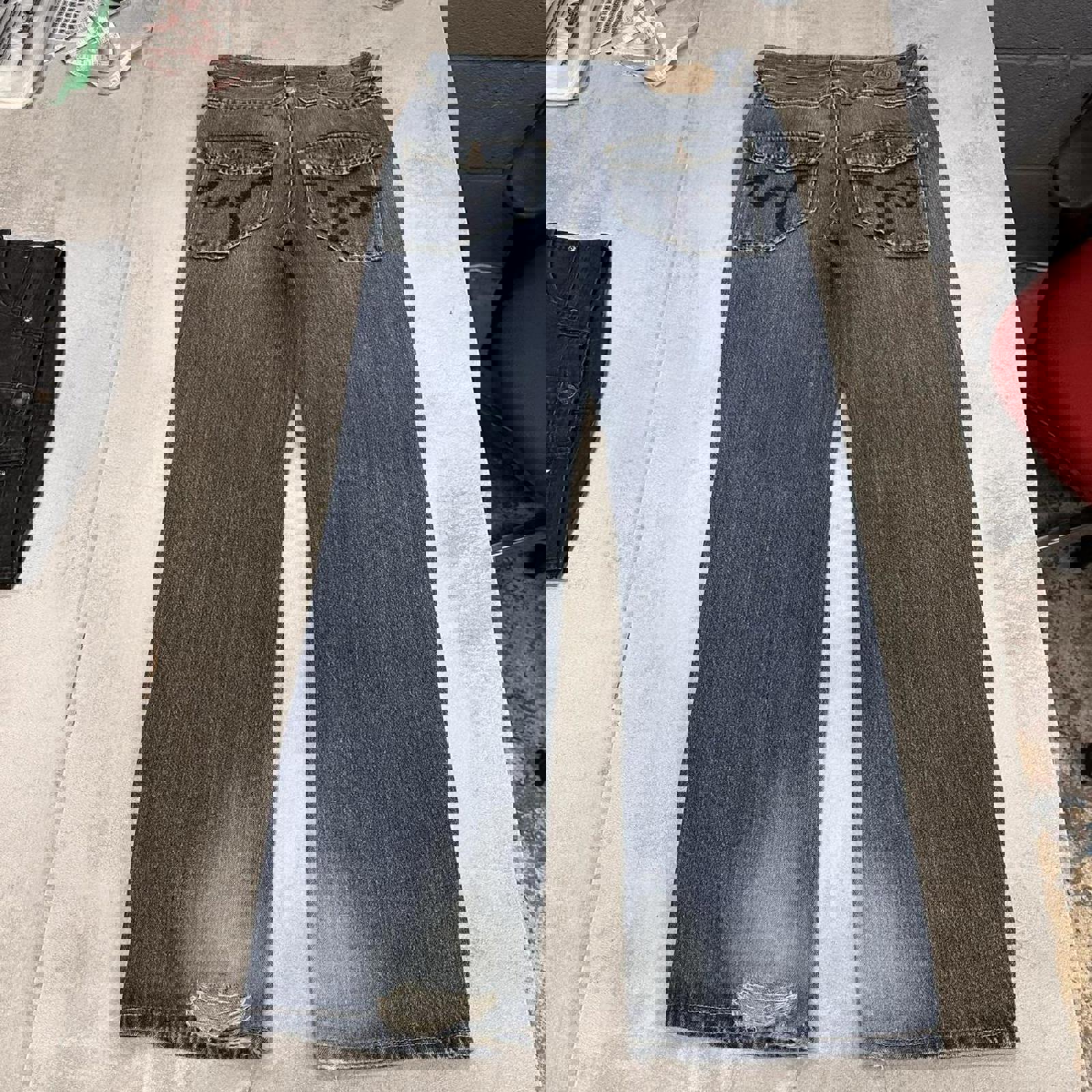 Good overall condition with slight faded discolouring/yellowing to the denim. Tear at end of left leg.