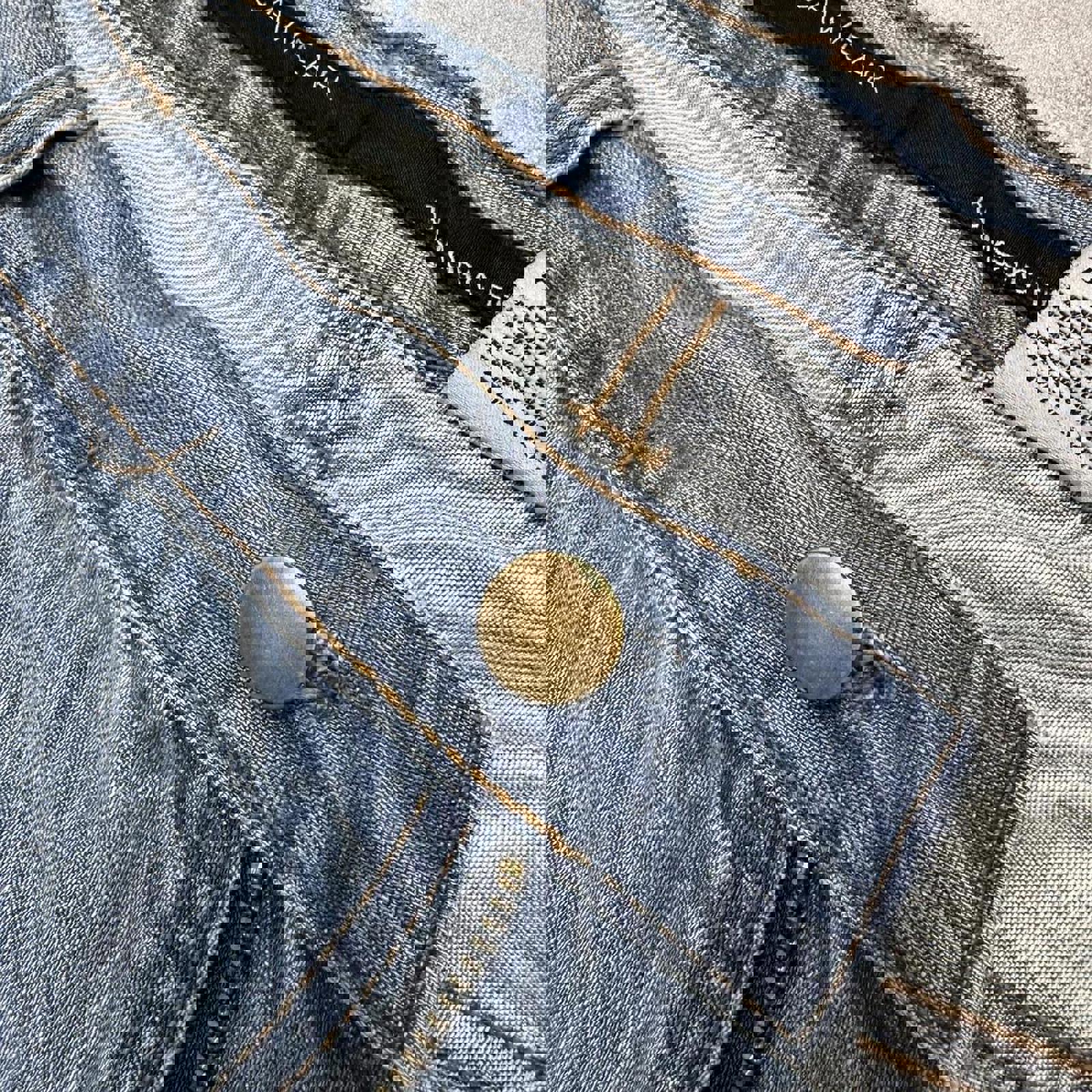 Good condition with a nice denim faded style and a few feint marks. Distressing where new fastener button has been fitted