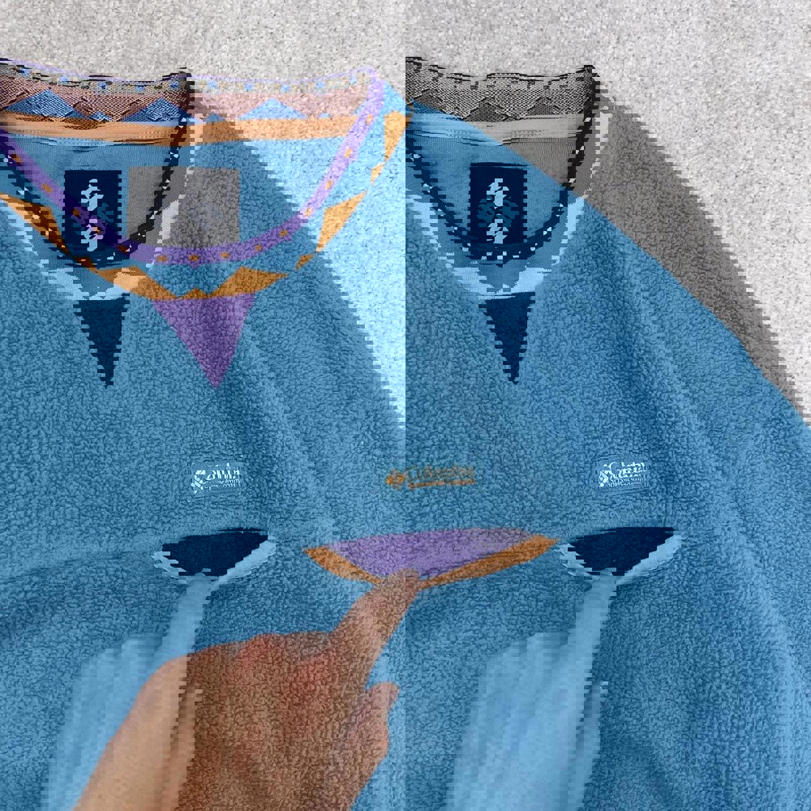 Blue Columbia Sportswear pull over technical fleece with patch logo, chest pocket and aztec pattern neckline