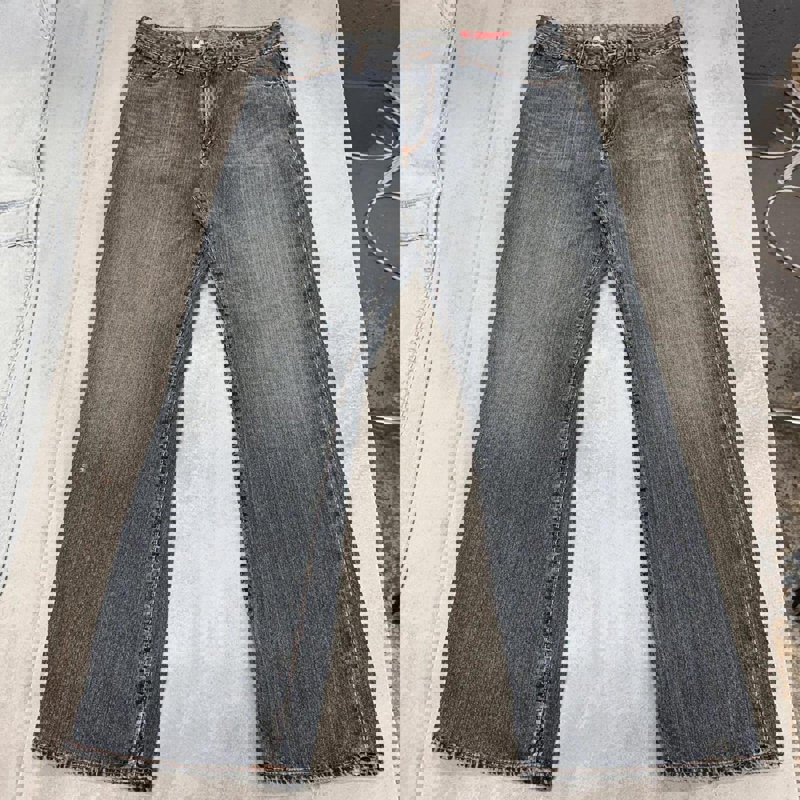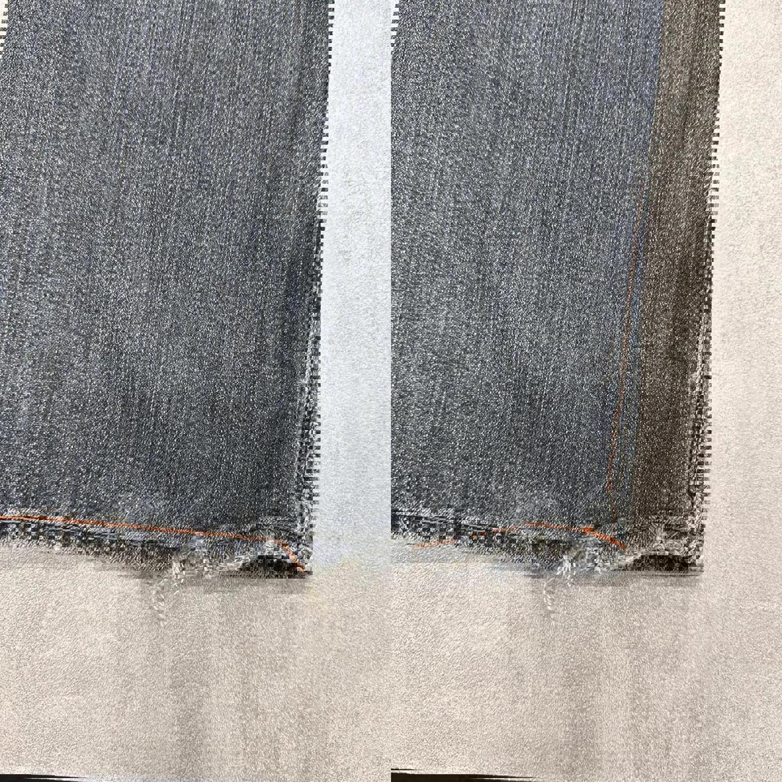 Good overall condition with denim fading. Distressing at ends of legs. Small distressed hole on right leg.