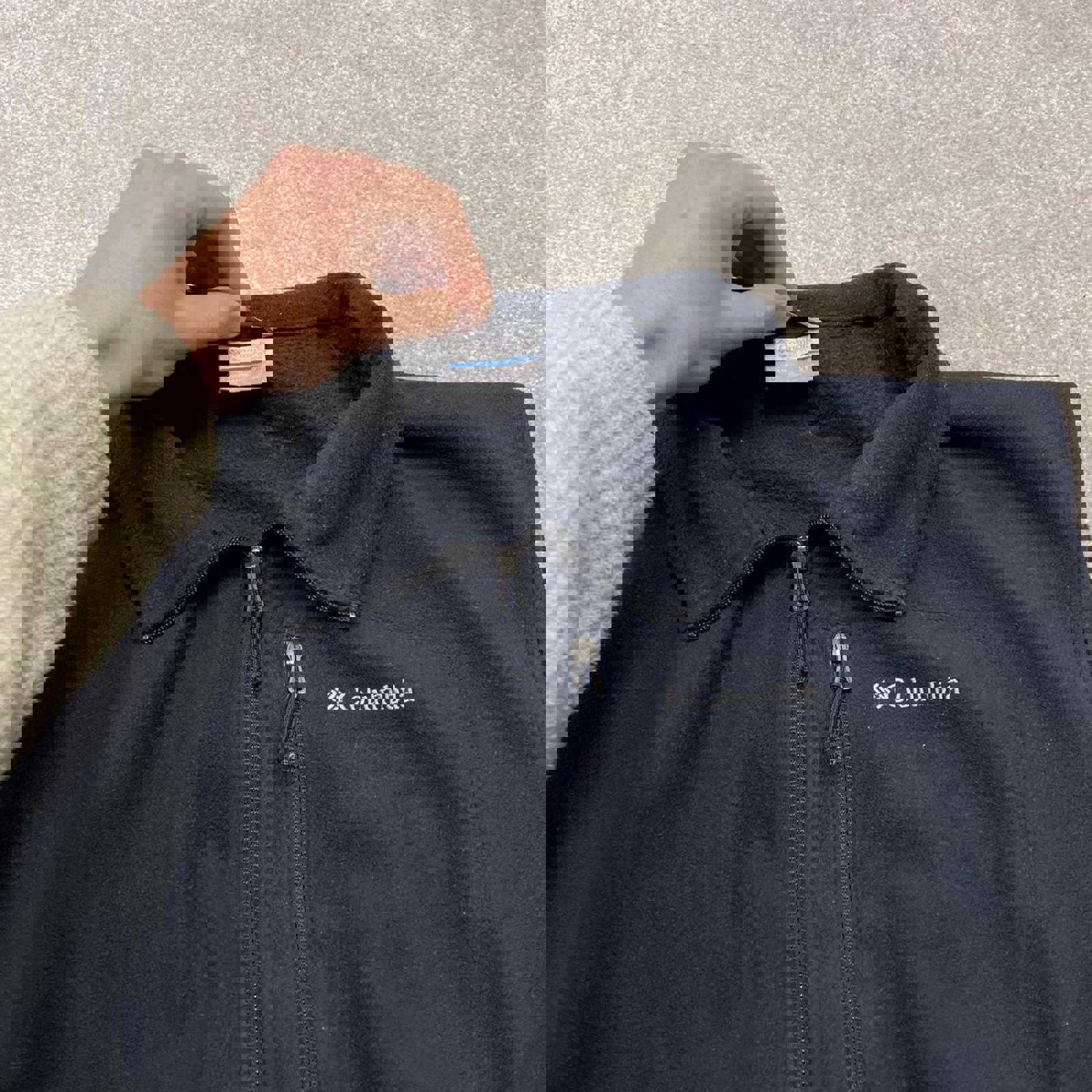 Black Columbia Sportswear fleece with zip pockets, embroidered logo and adjustable waist