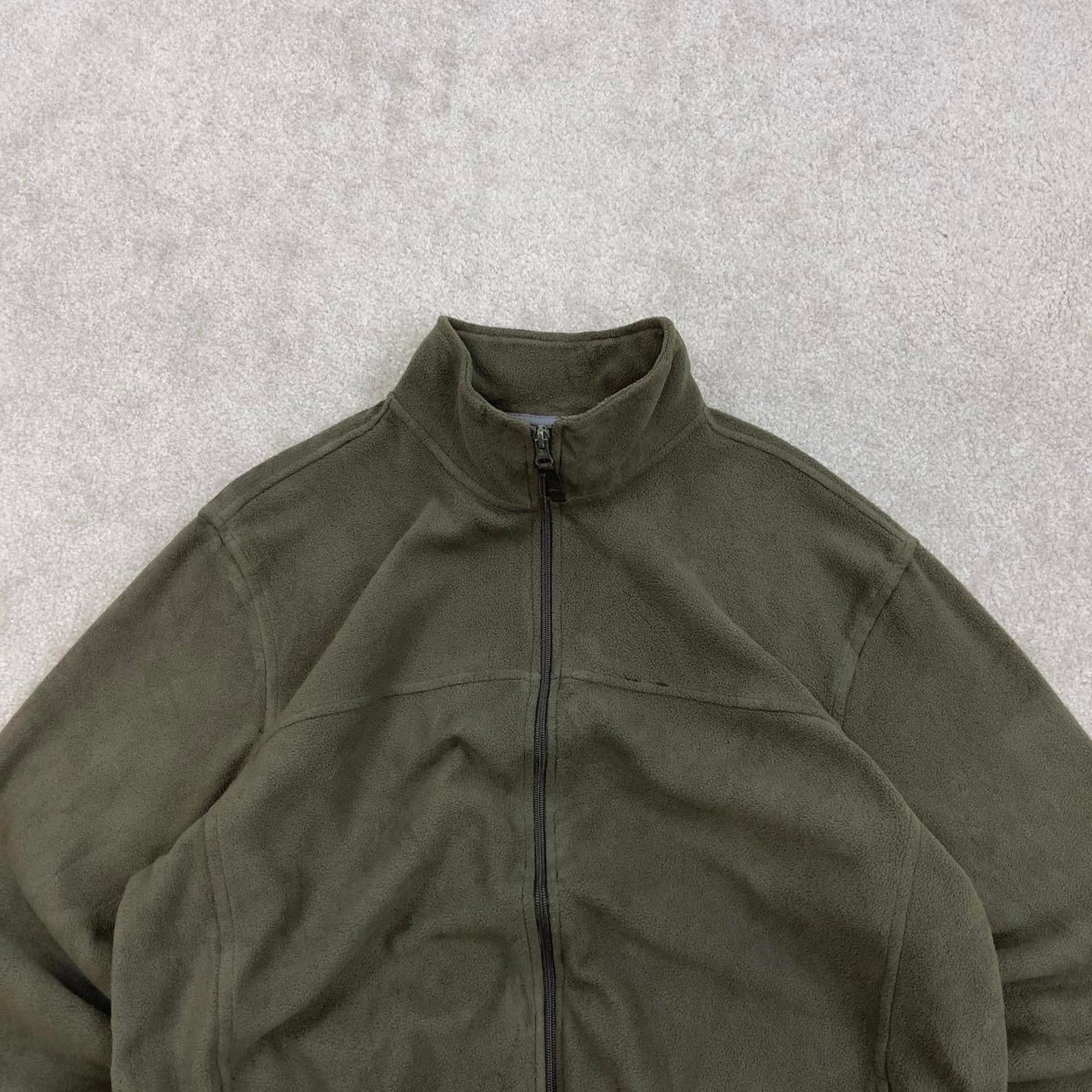 Green fleece, zip up, embroidered logo, technical winter, outdoor wear, accents, athletic style, cozy layering, fall fashion