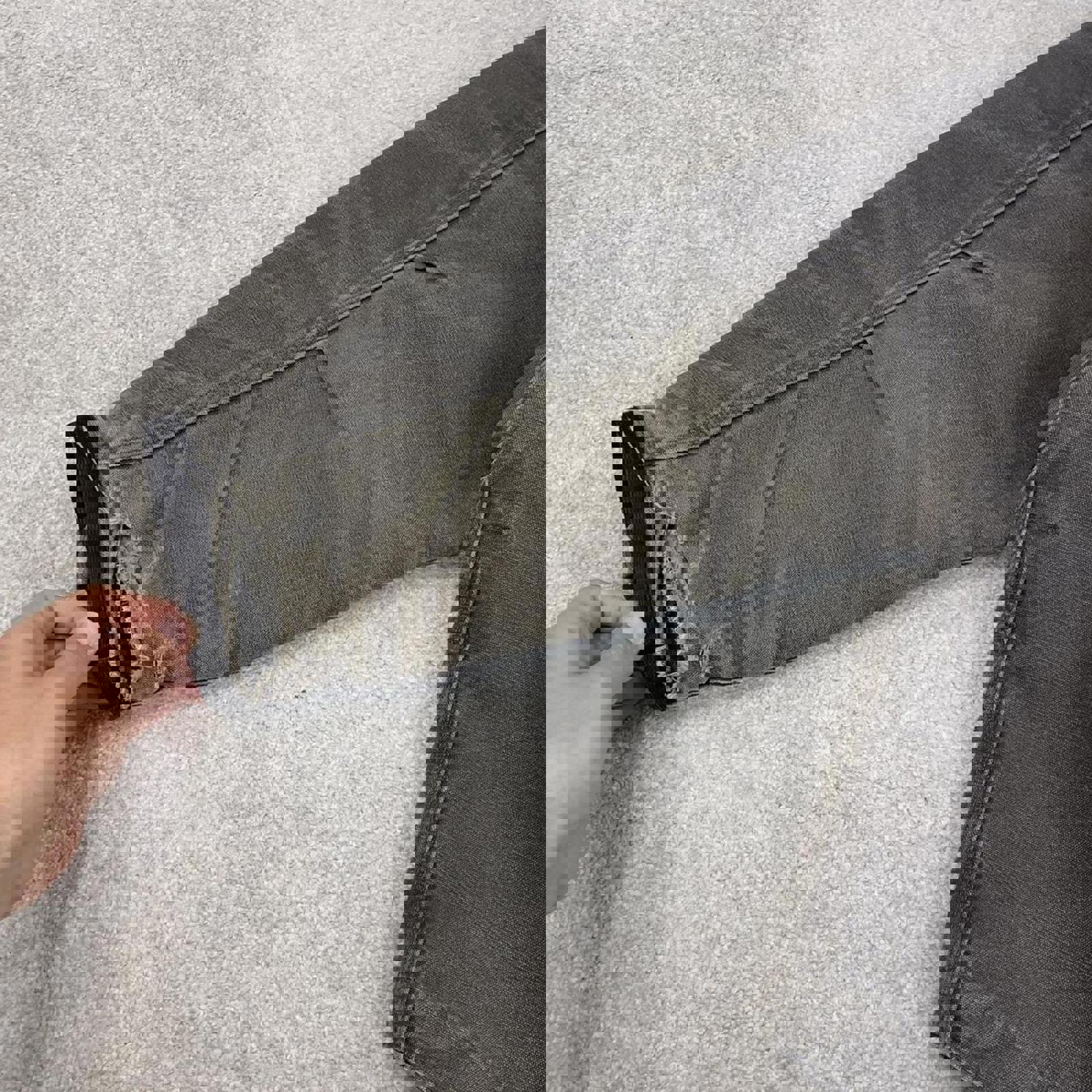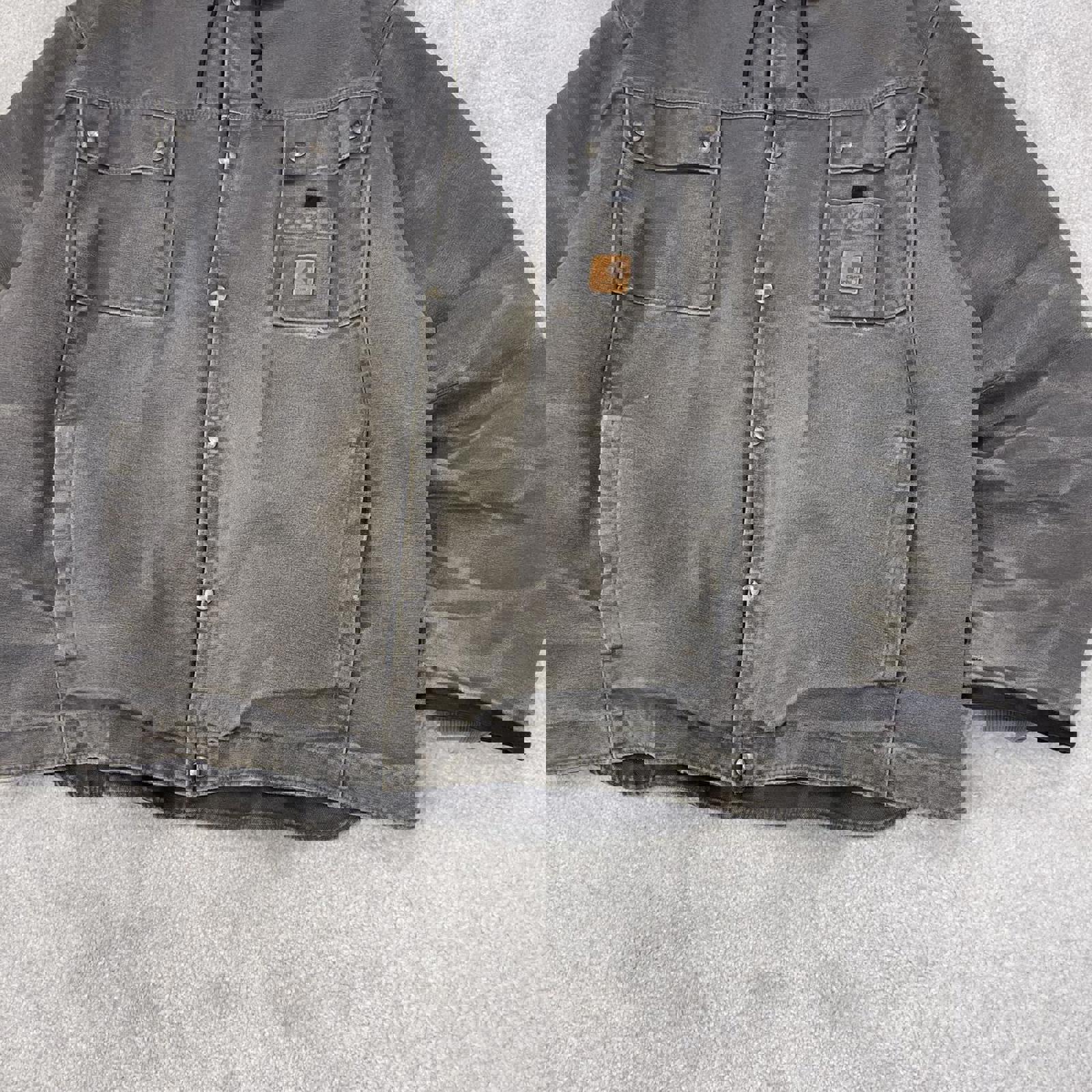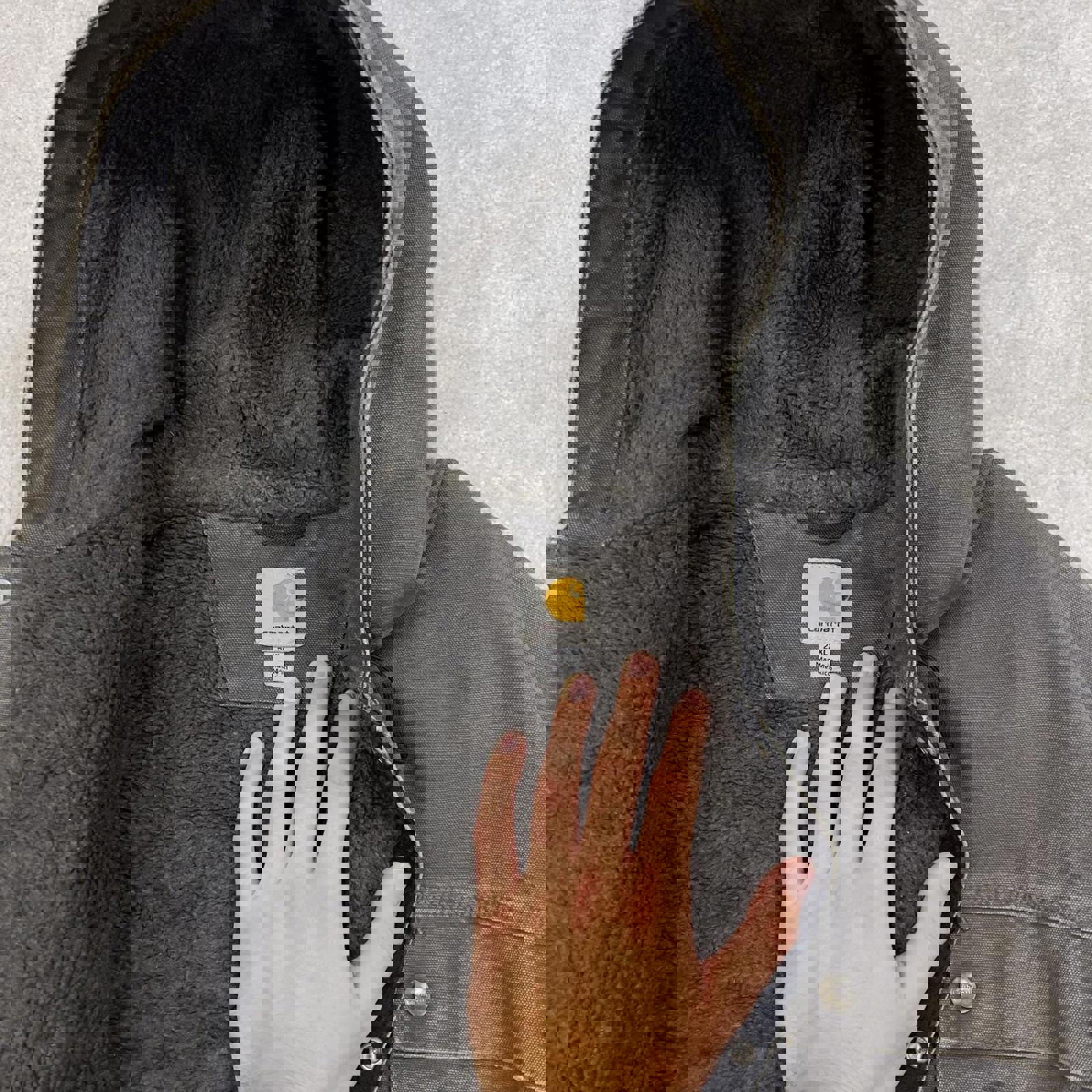 Faded grey canvas workwear jacket with sherpa lining and internal pockets