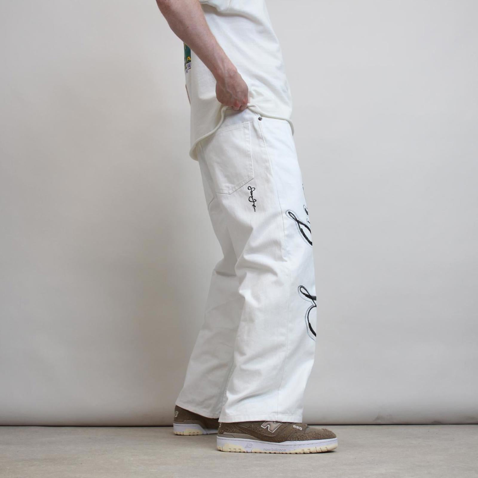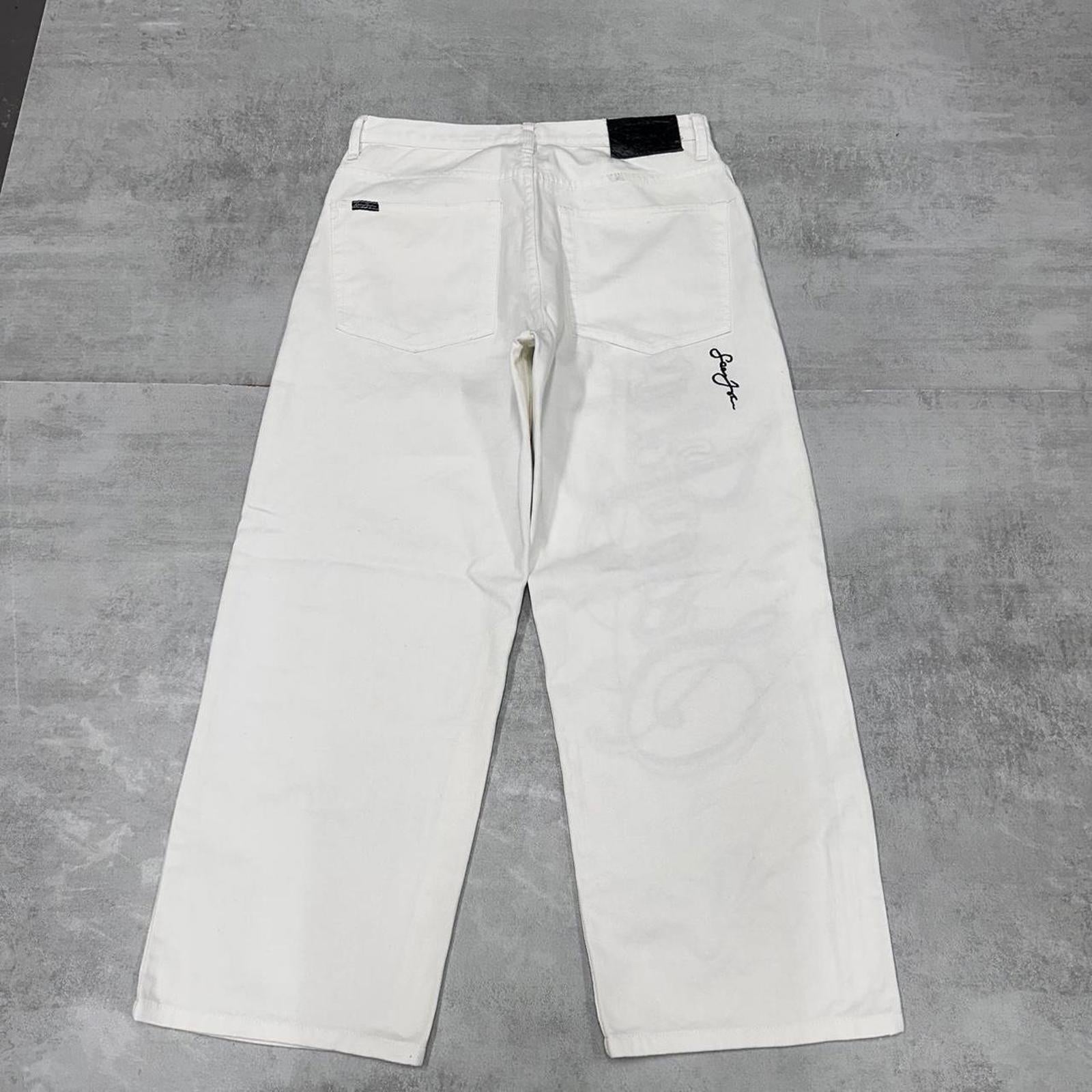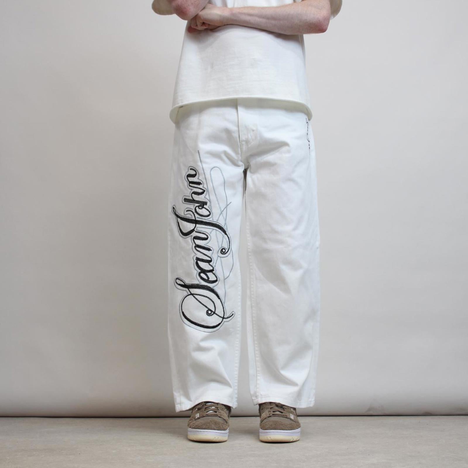 White Sean John jeans with waist patch, embroidered logo and large embroidered design.