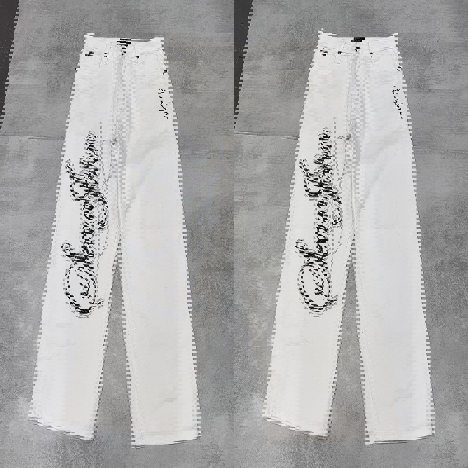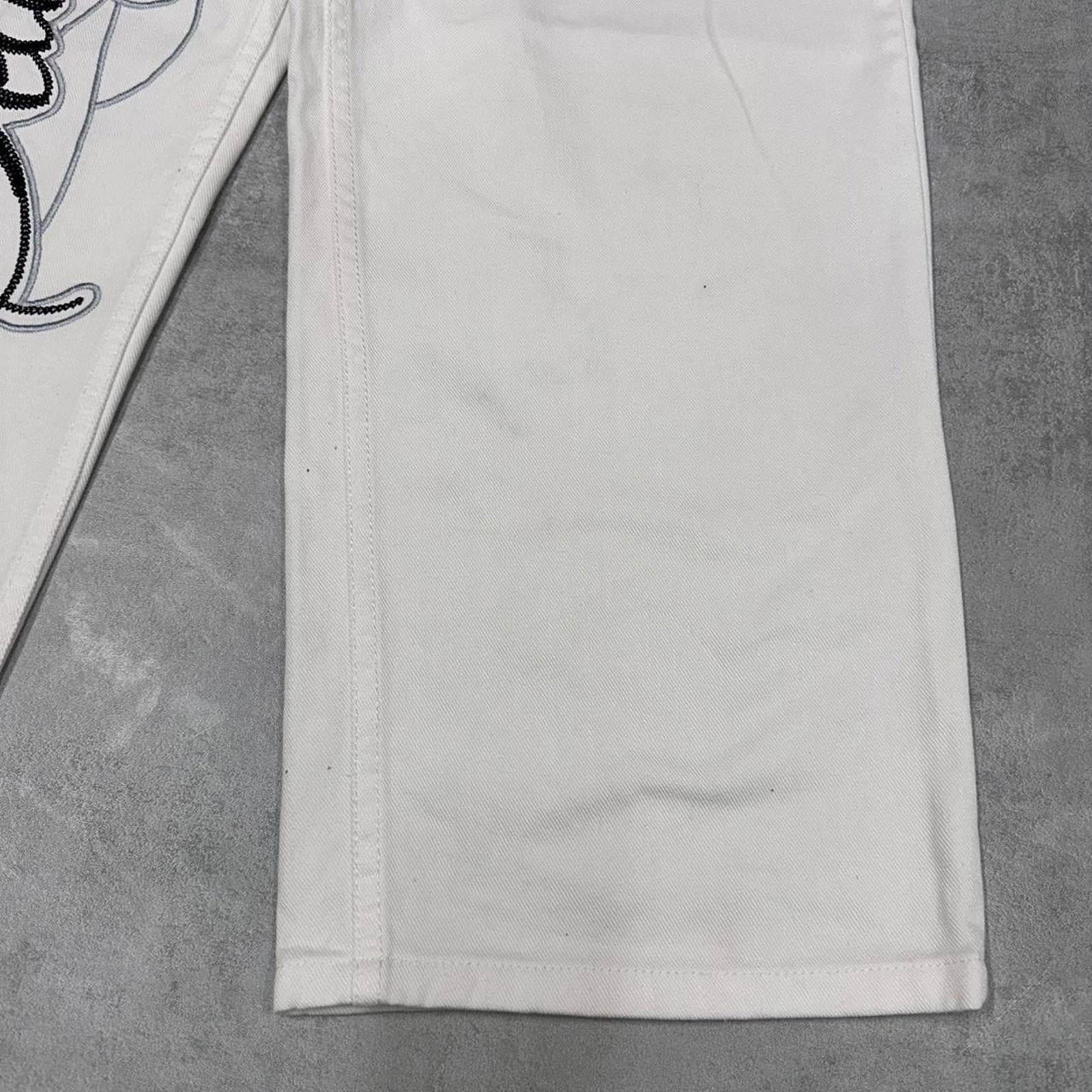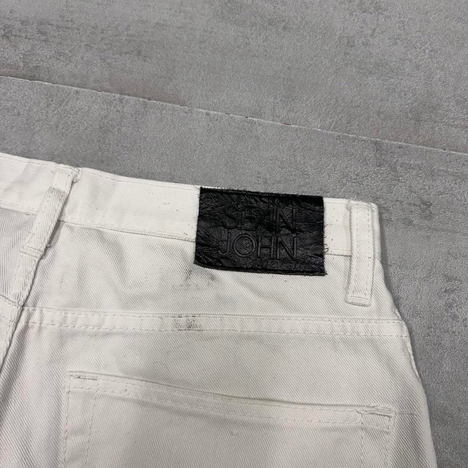 White Sean John jeans with waist patch, embroidered logo and large embroidered design.