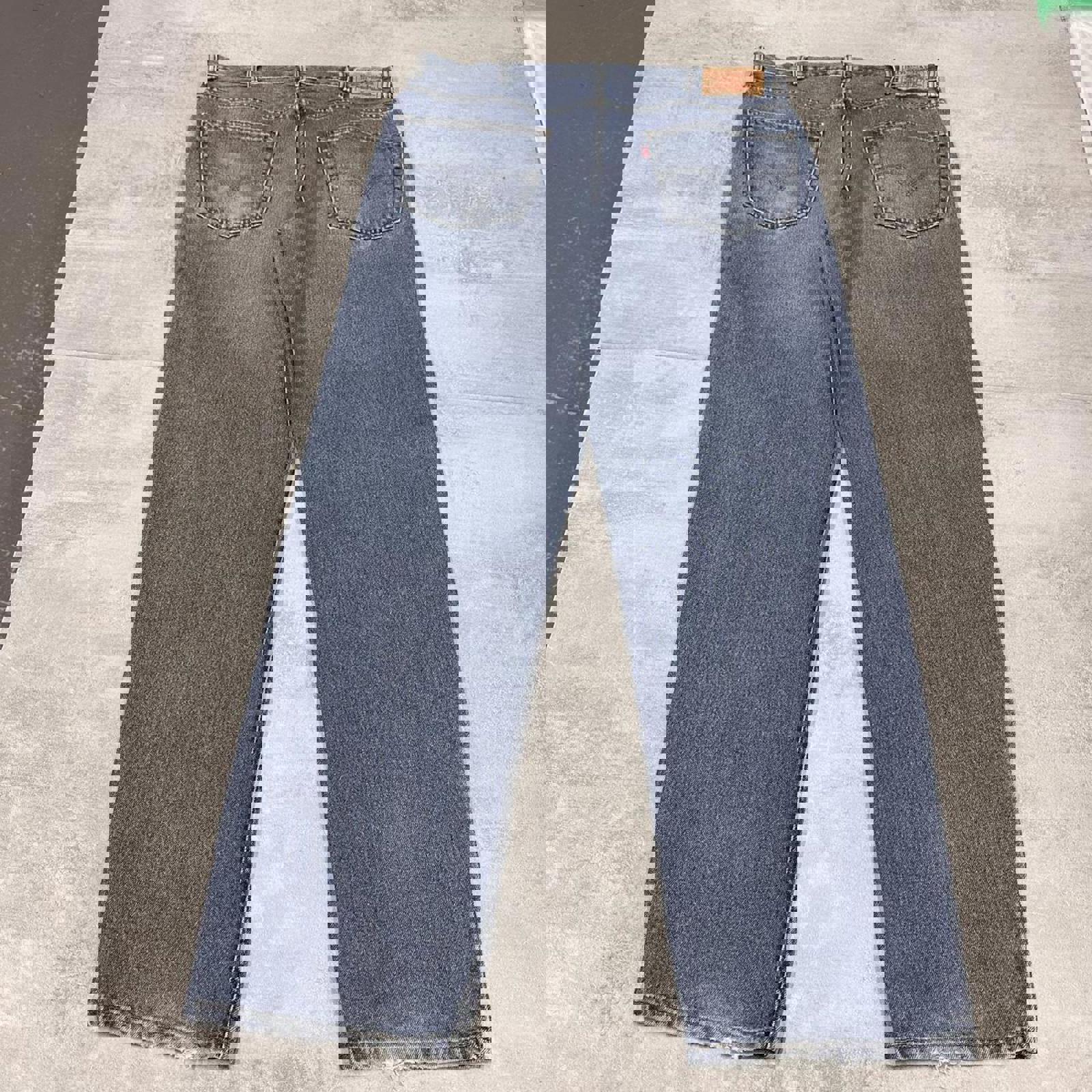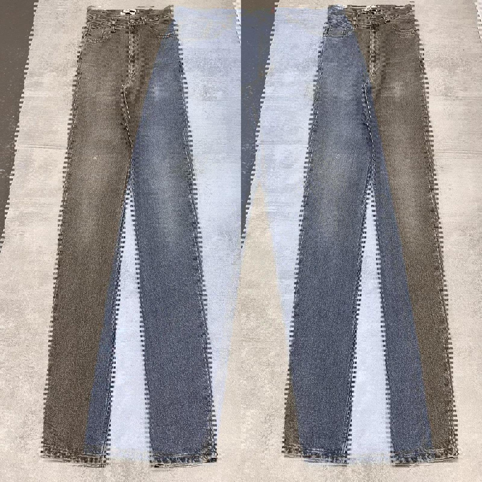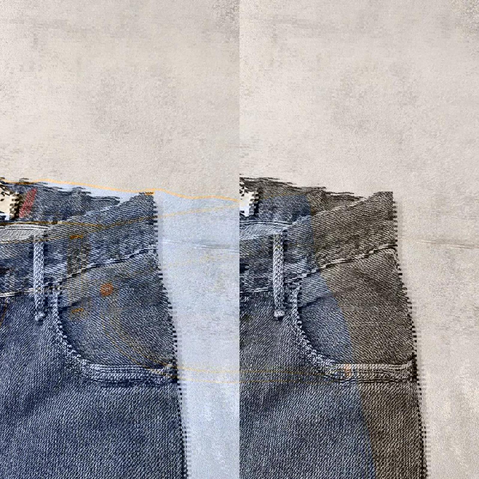 Good condition with slight denim fading. Light distressing on right leg and distressing at ends of legs. Light marks on left pocket