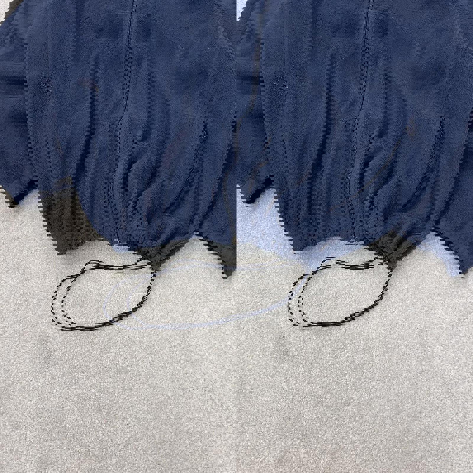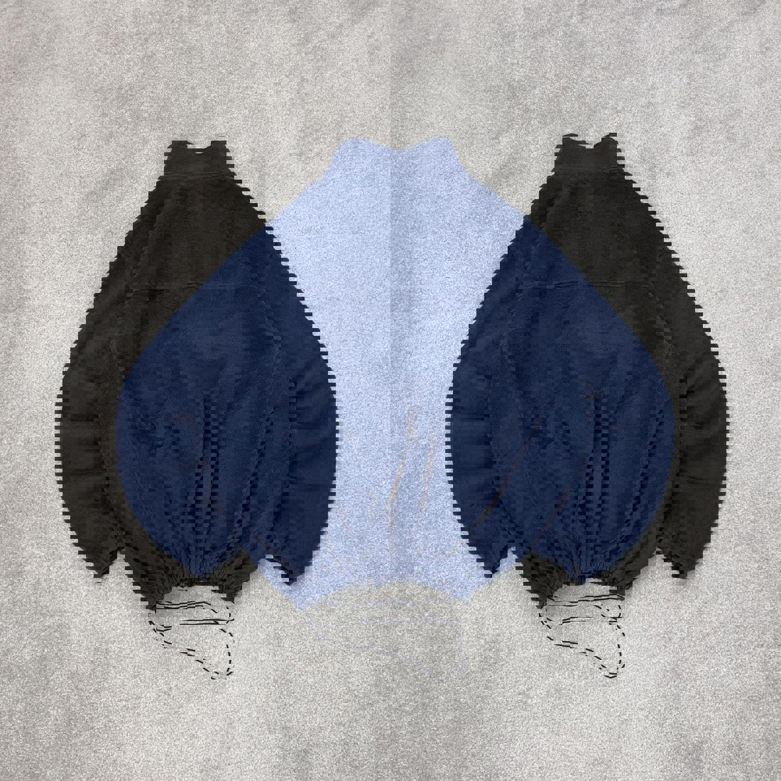 navy fleece, technical outerwear, embroidered logo, zip pockets, adjustable waistband, oversized fit, winter layer, Y2K style, outdoor apparel, athletic streetwear