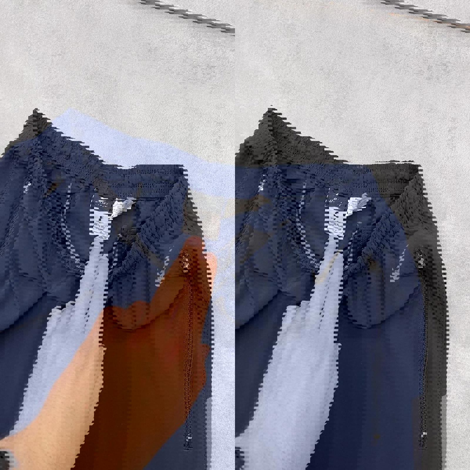 Navy Nike Dri-Fit track pants with drawstring waist, pockets and print Swoosh logo
