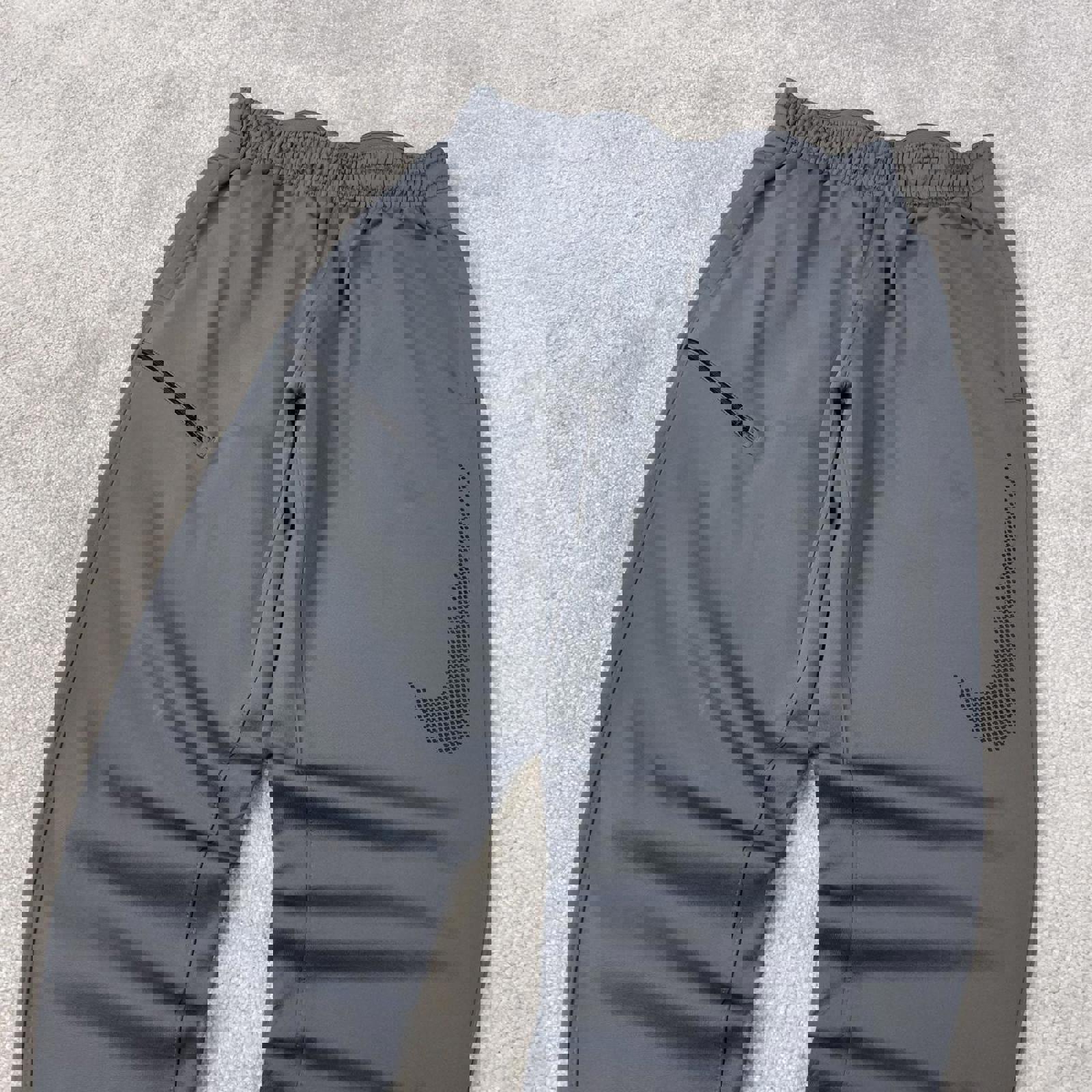 Grey Nike track pants with drawstring waist, pockets and print logo