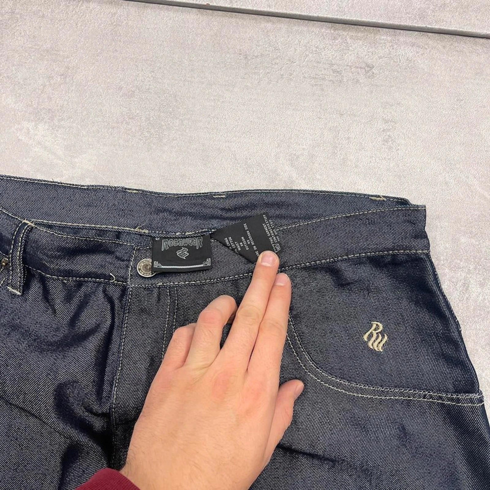 Holographic style blue Rocawear hip hop jeans with waist patch and embroidered logos