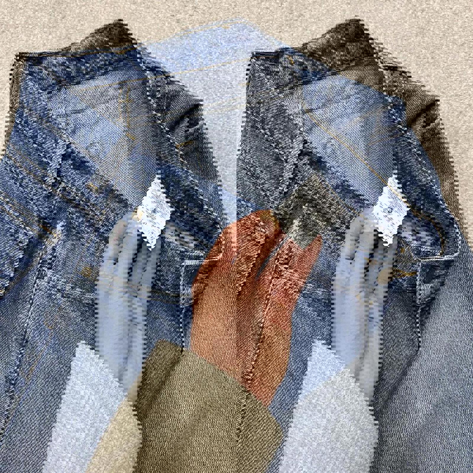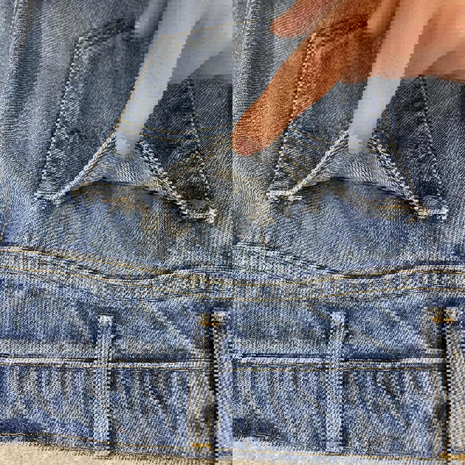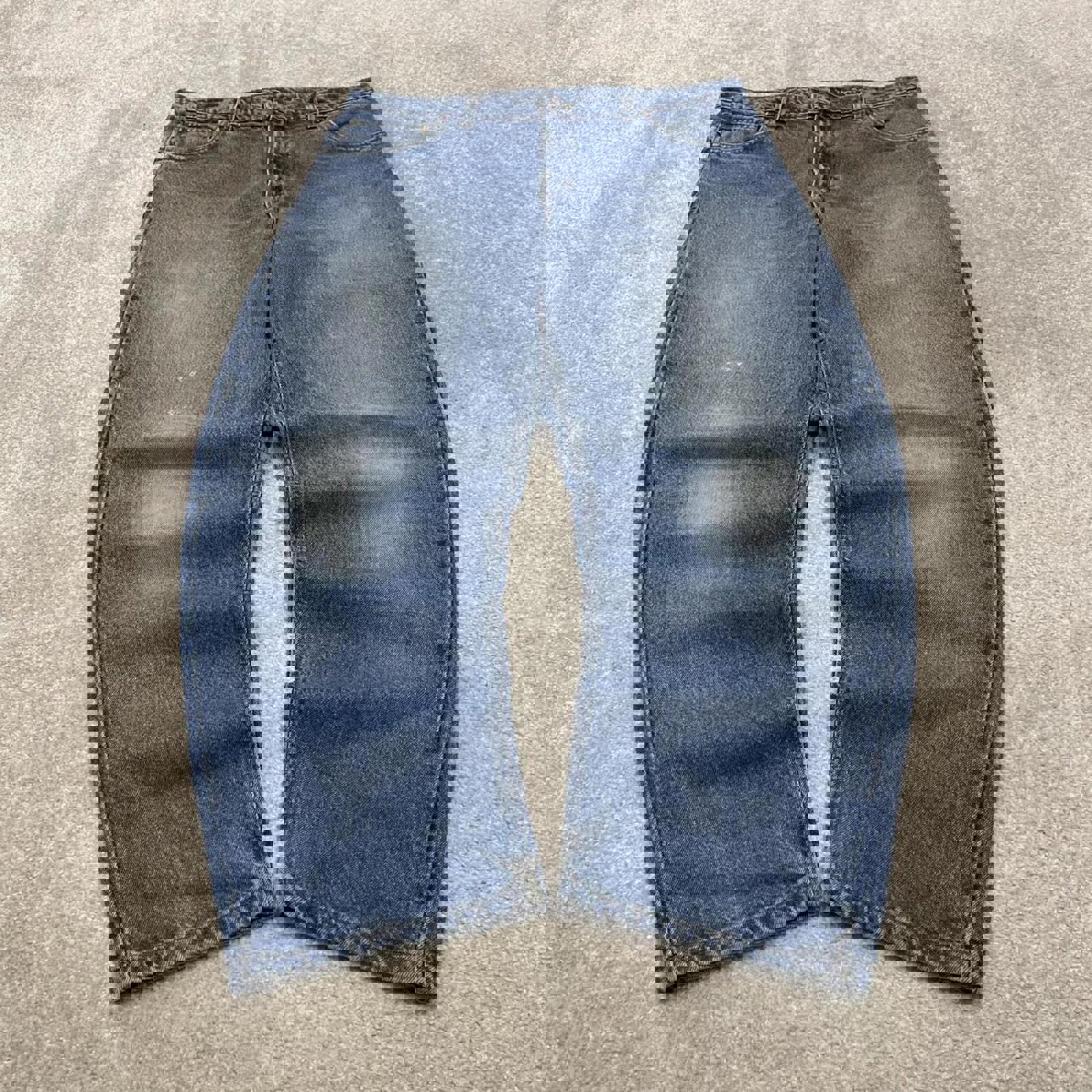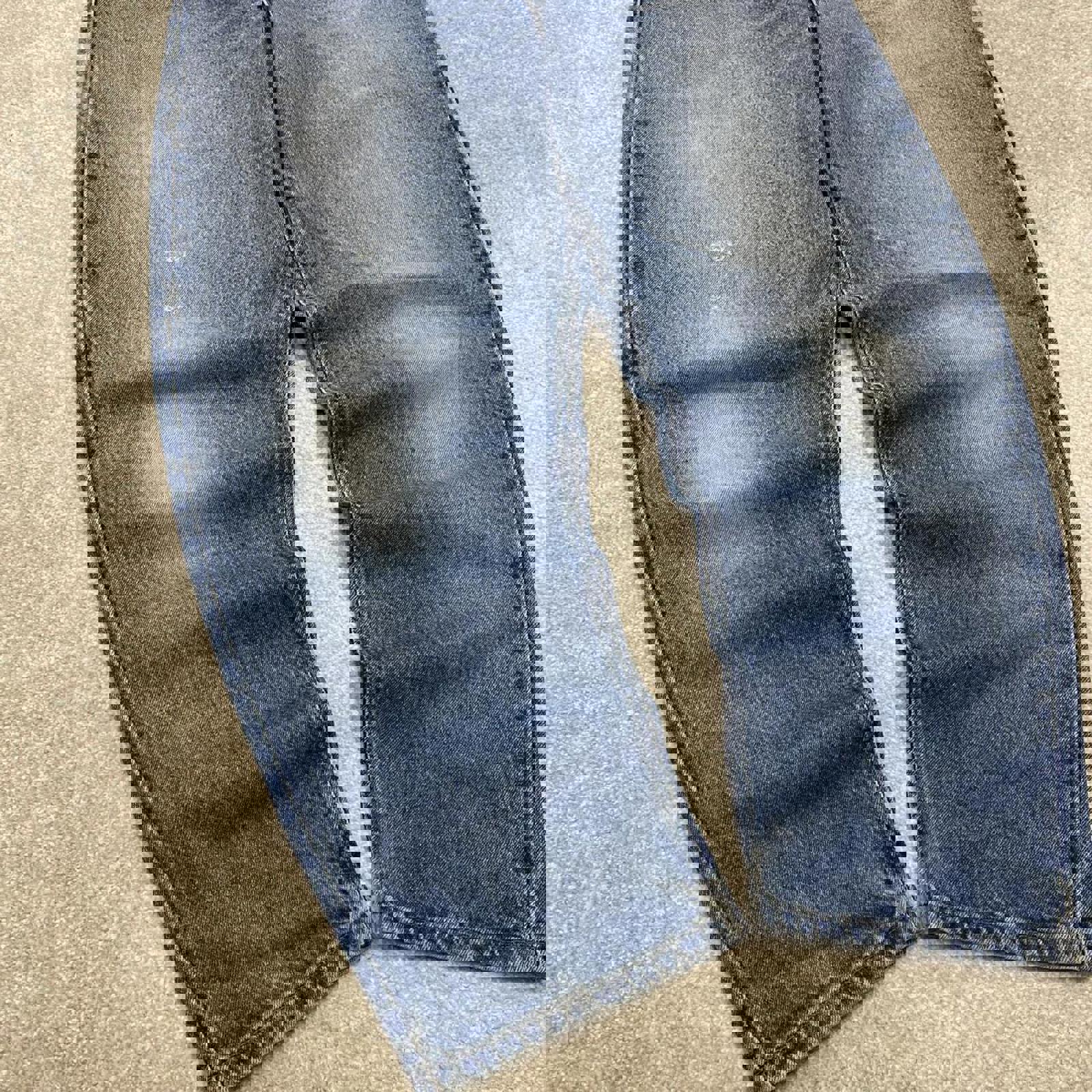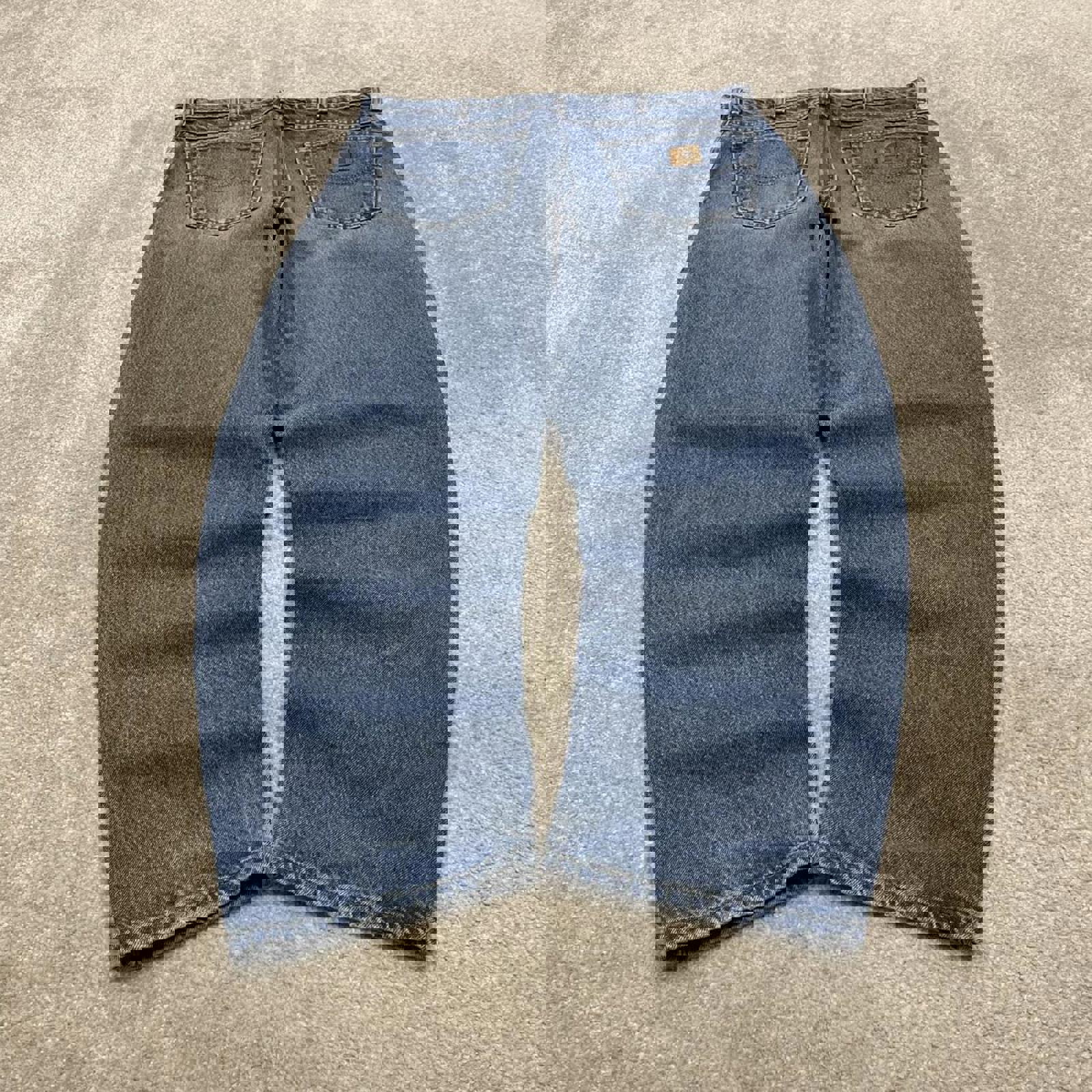 Great pair with faded stains throughout. distressing on right leg. concrete textured marks throughout inside of back left pocket