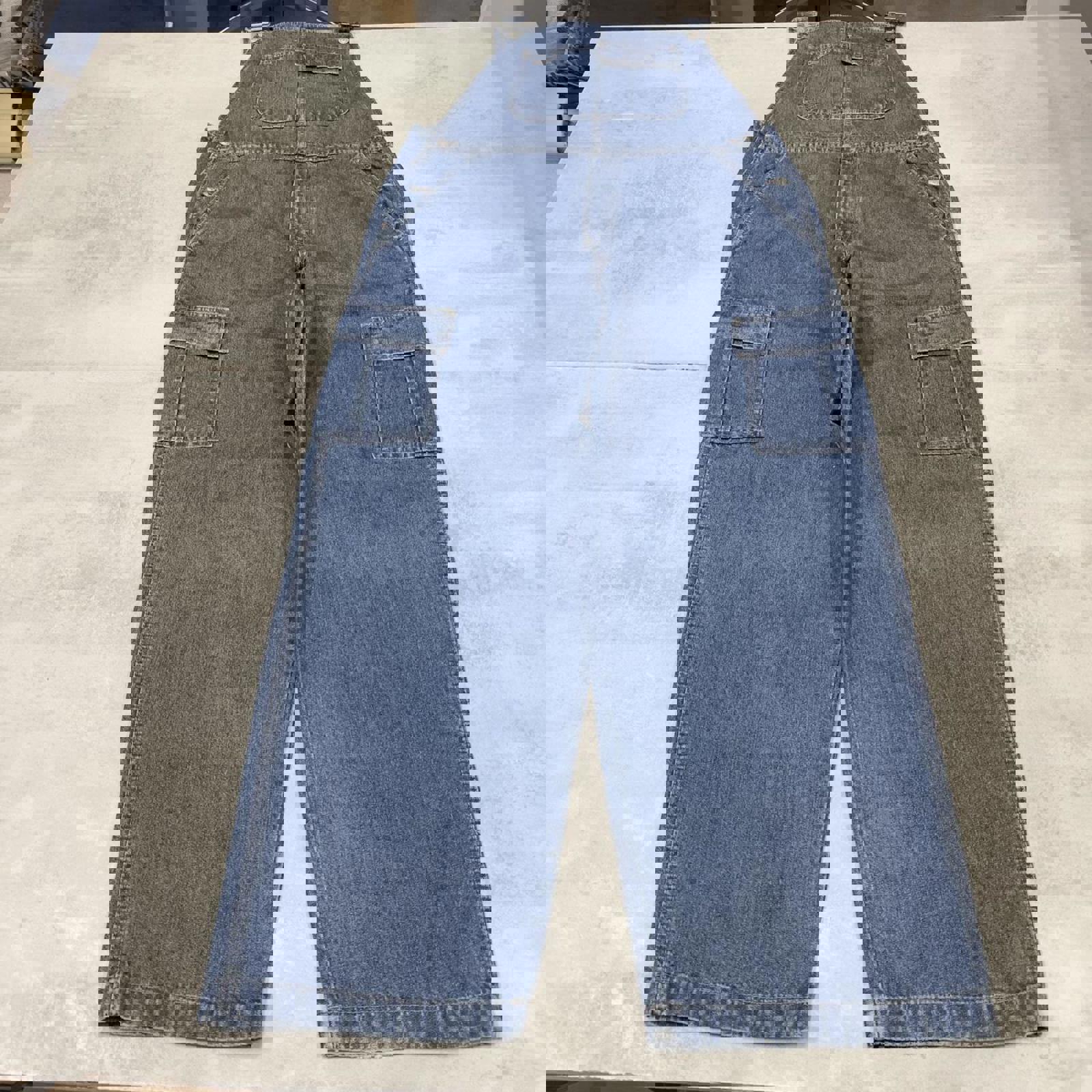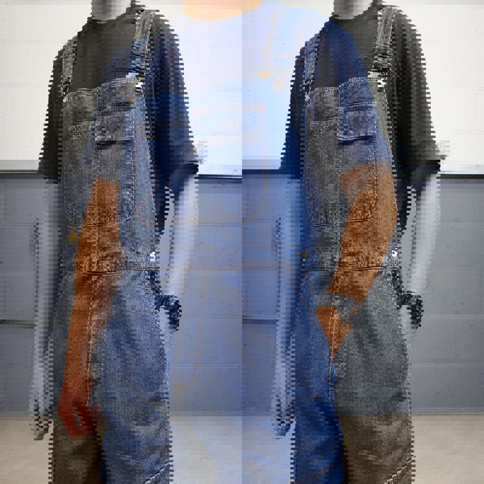Loose blue Faded Glory dungarees with cargo pockets and adjustable straps, perfect festival or skate wear
