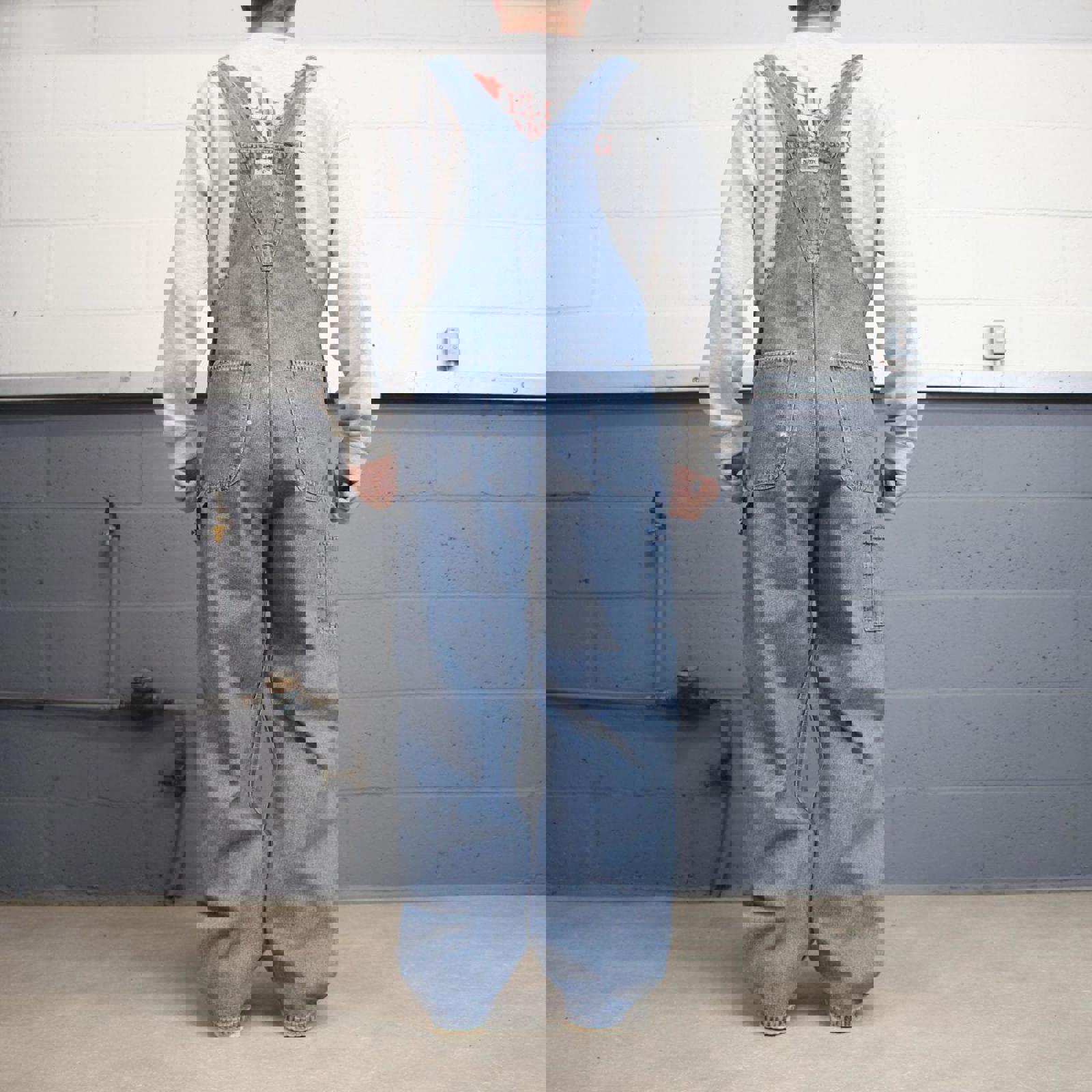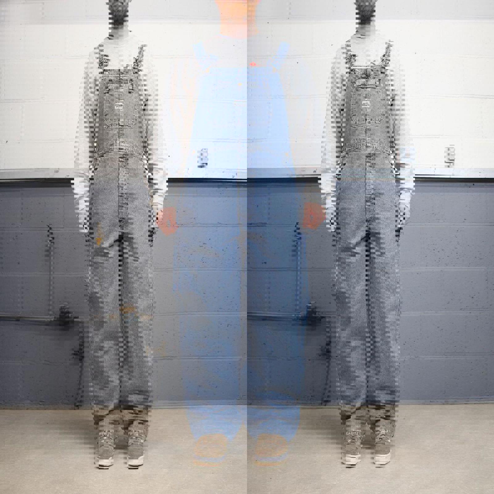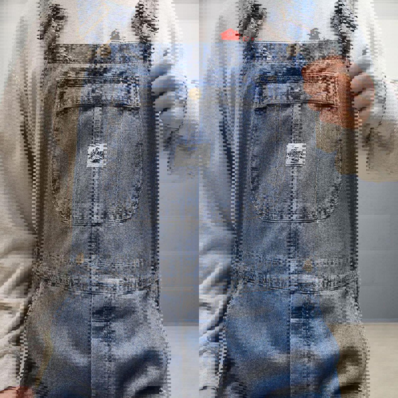 Loose blue Lee dungarees with patch logos and adjustable straps, perfect festival or skate wear