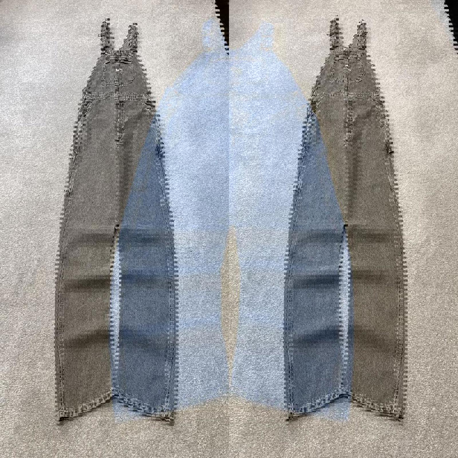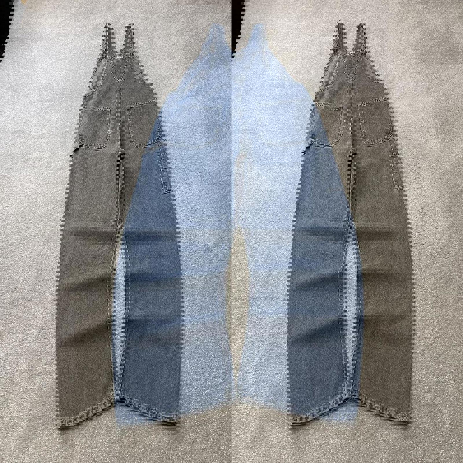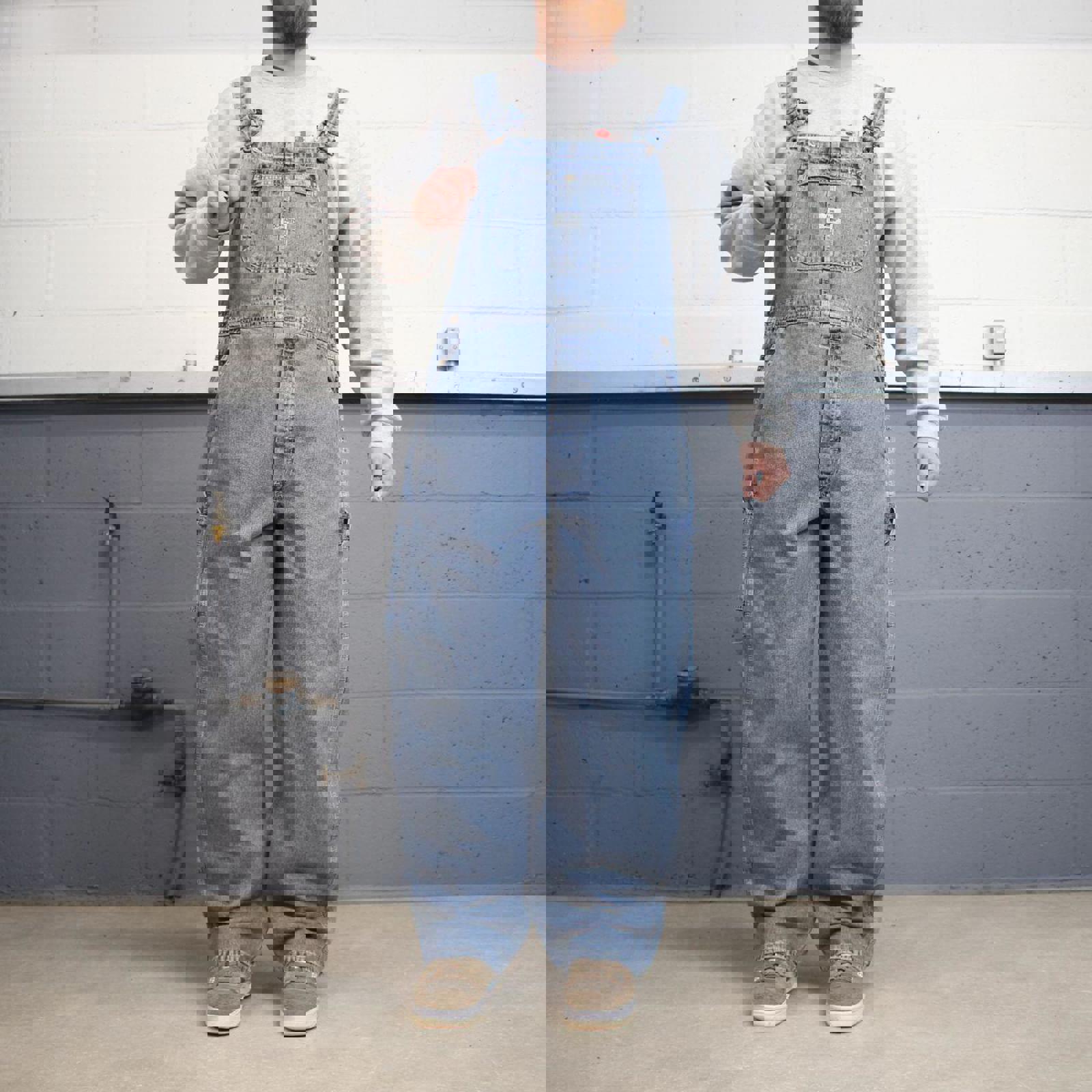 Loose blue Lee dungarees with patch logos and adjustable straps, perfect festival or skate wear