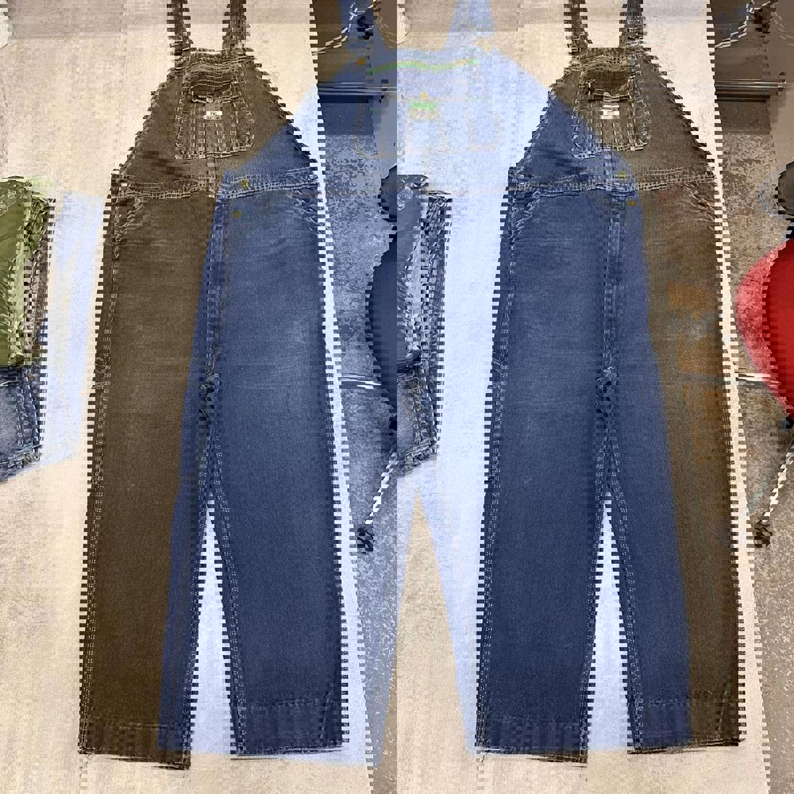 Loose blue Liberty dungarees with patch logos and adjustable straps, perfect festival or skate wear
