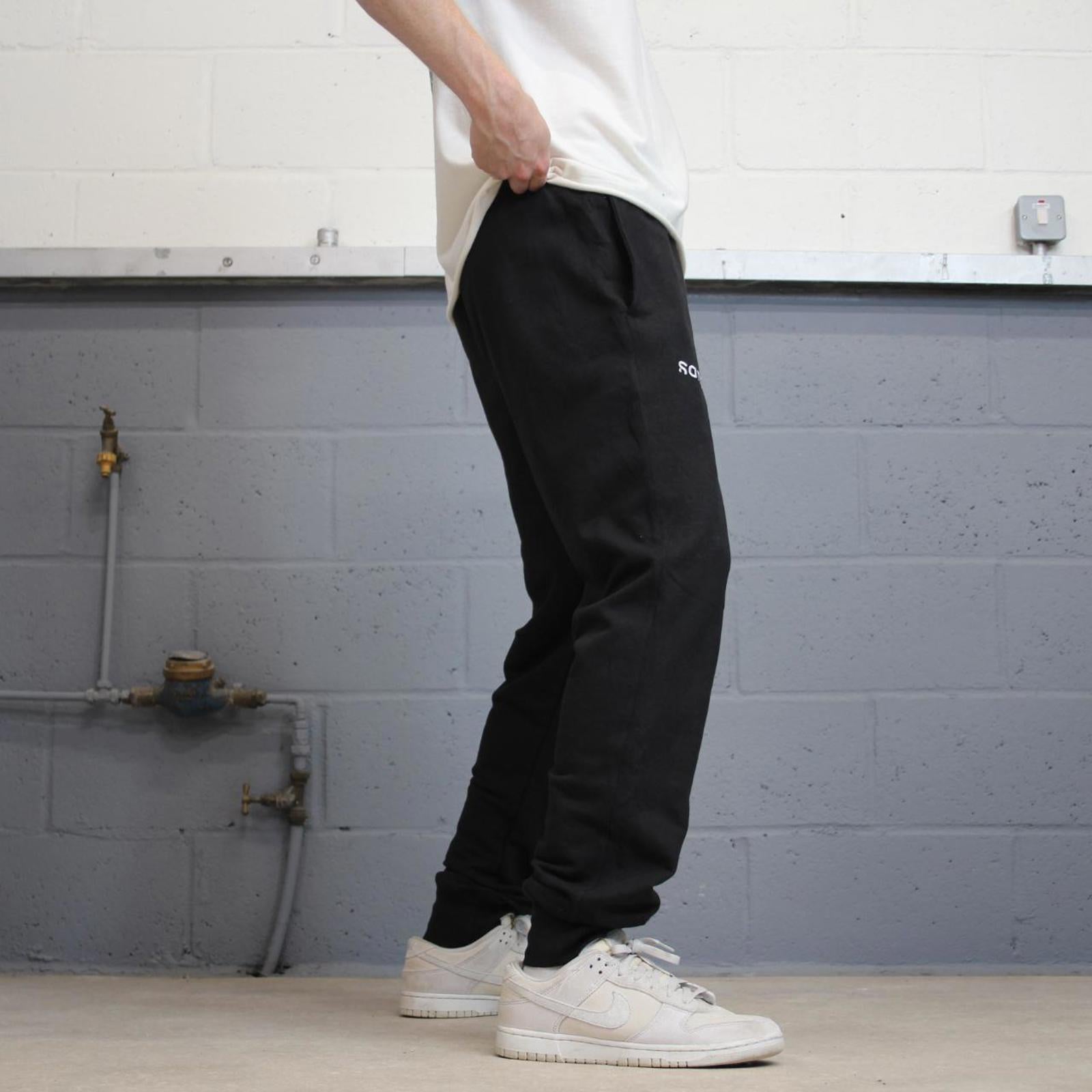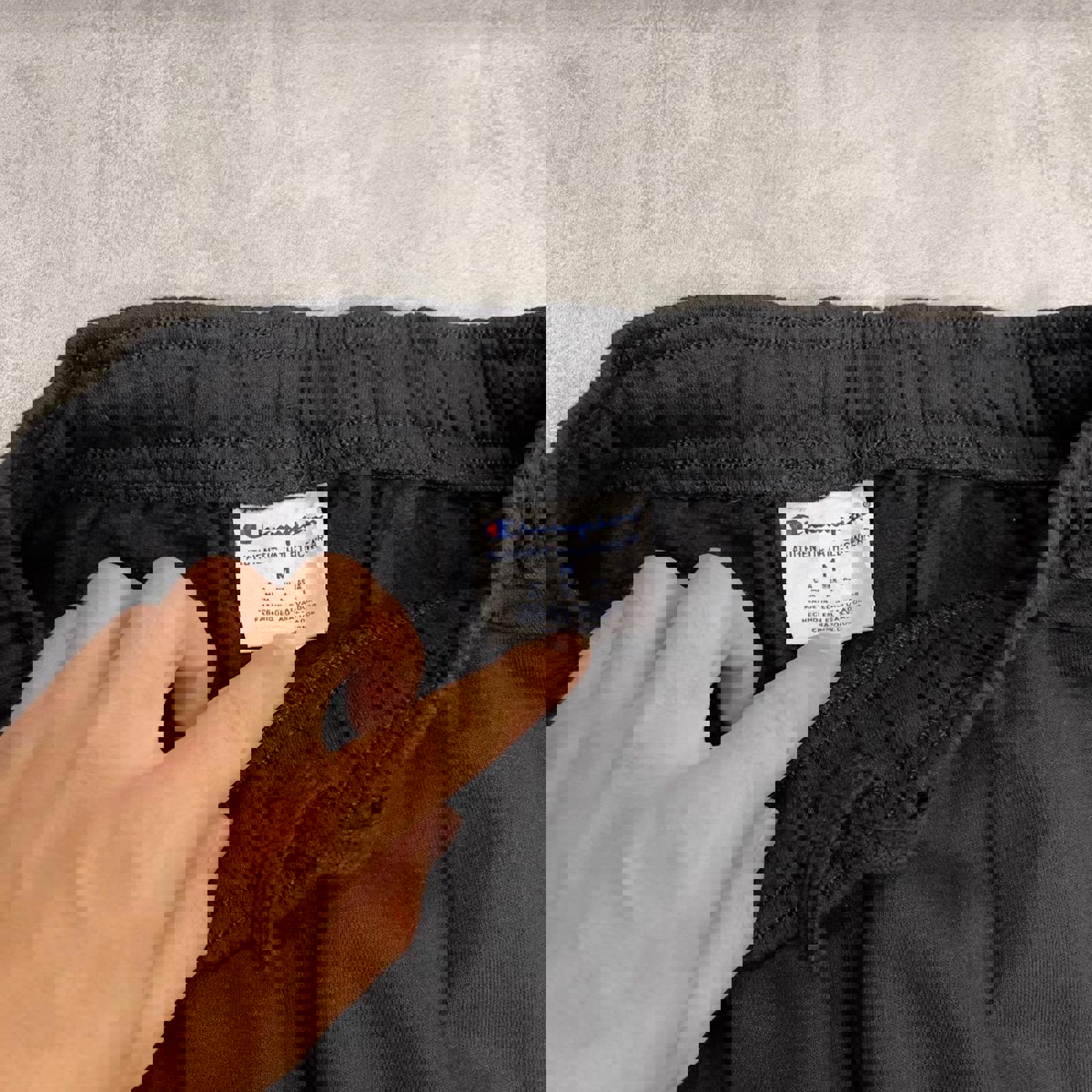 Black Champion track pants with drawstring waist, pockets and embroidered logos