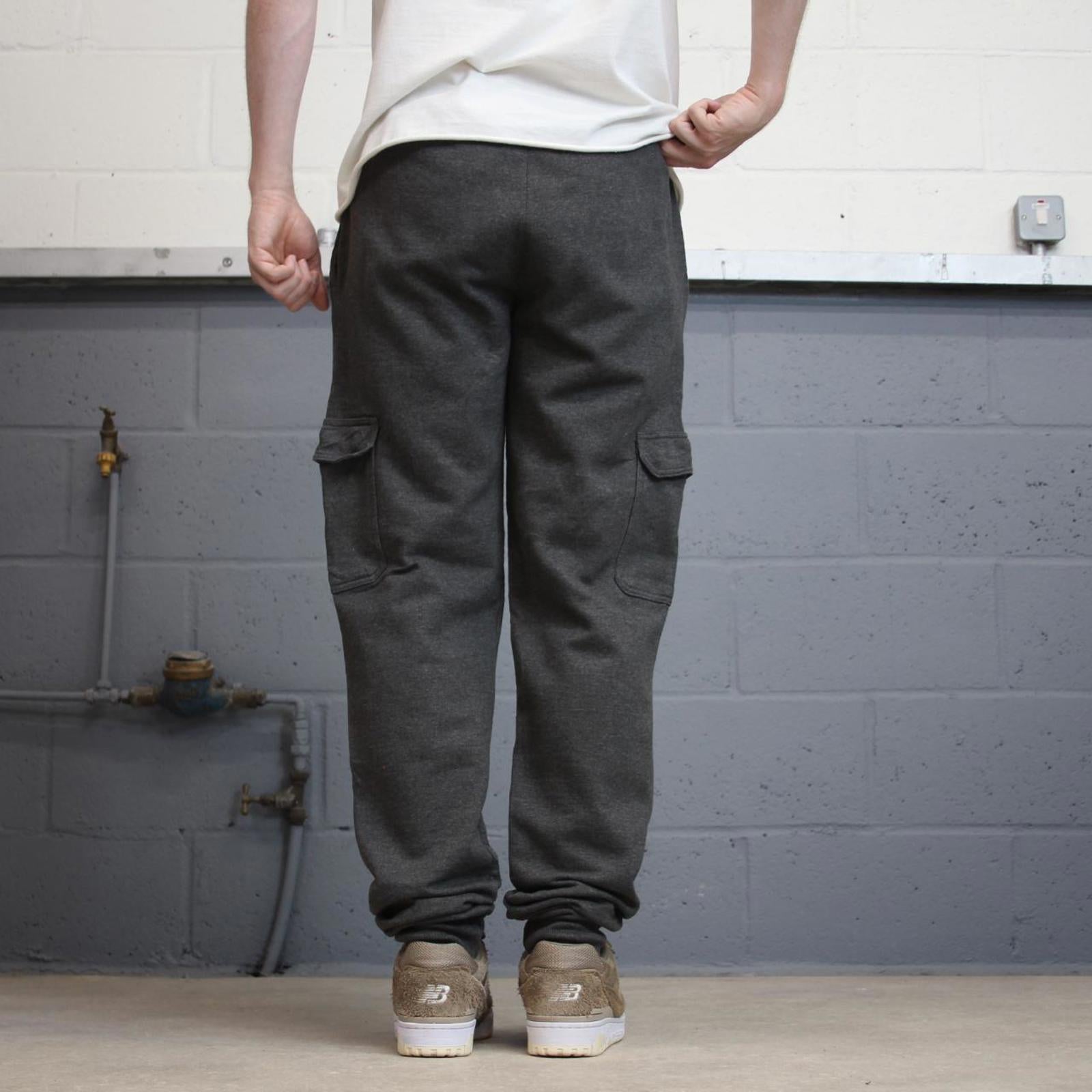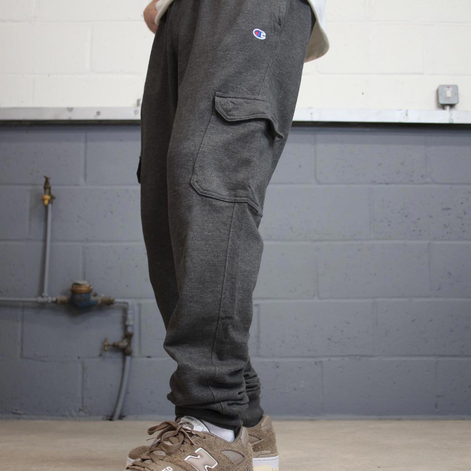 Grey Champion track pants with drawstring waist, cargo pockets and embroidered logo